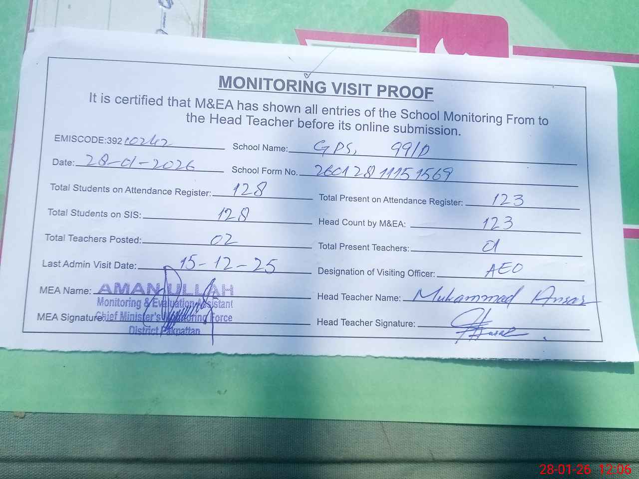 | EMIS Code: 39210242 | Name of School: GPS CHAK NO. 99 D | |||