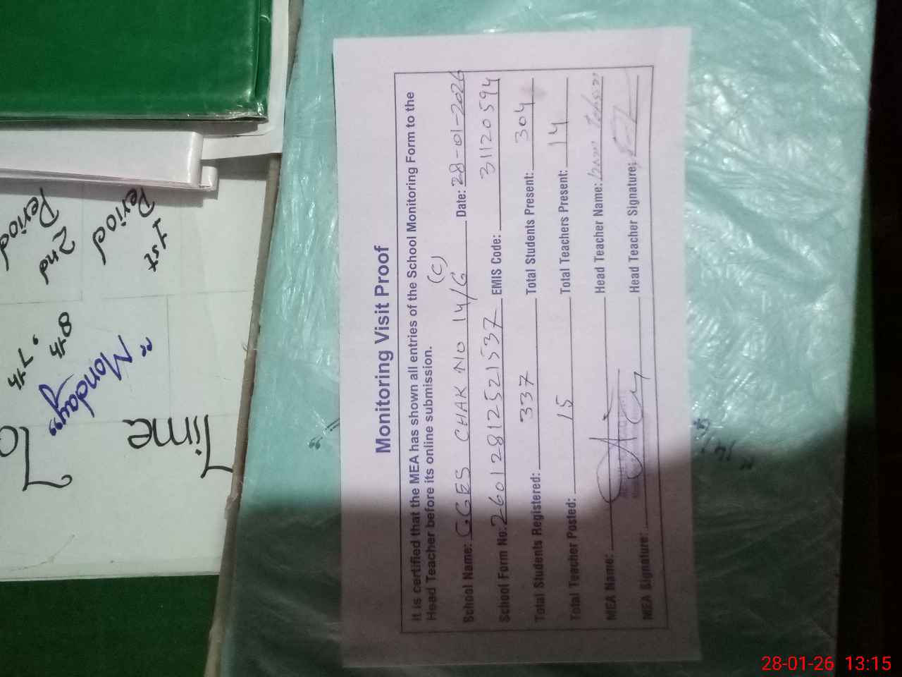 | Attendance Register | Head Teacher | MEA with School | Visit Proof |