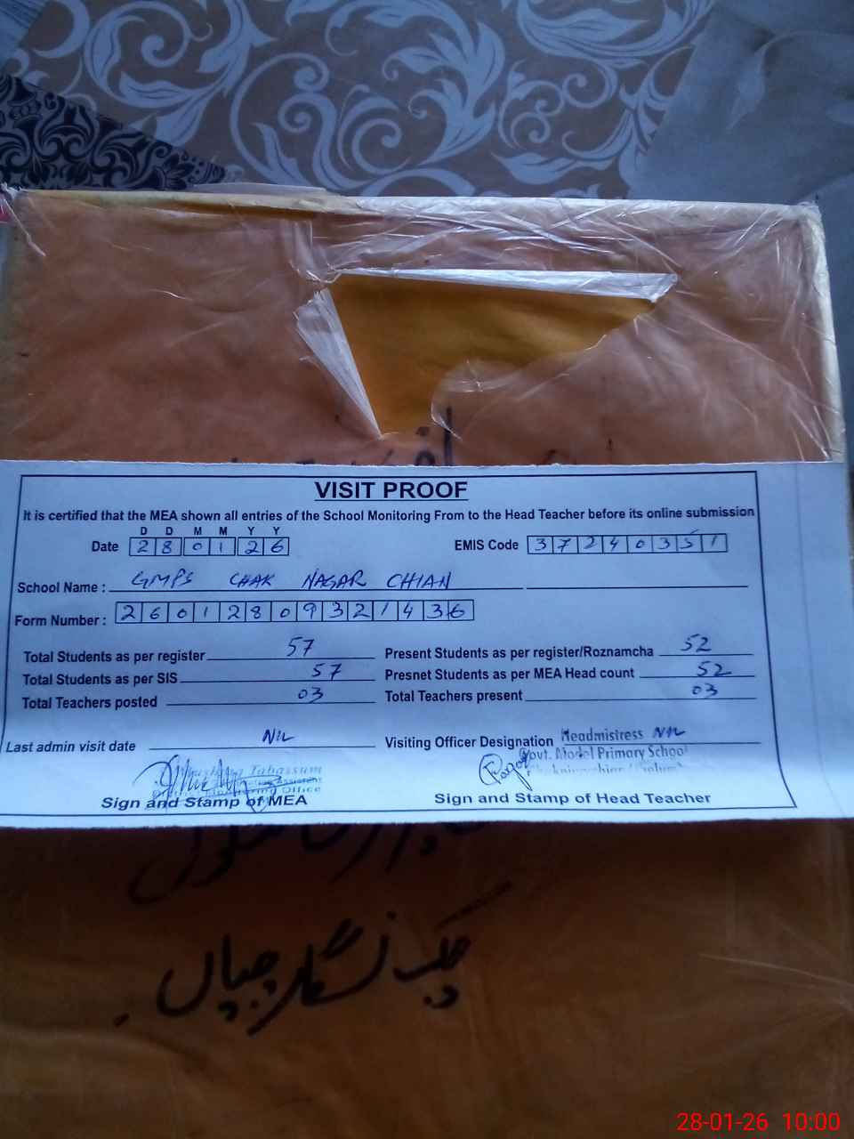 | Attendance Register | Head Teacher | MEA with School | Visit Proof |