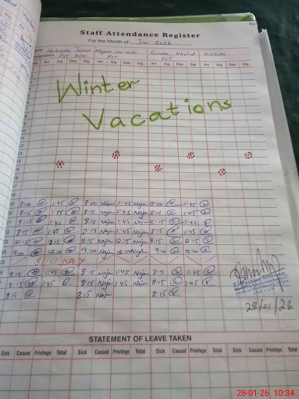| CNIC | Full Name | Designation | R/C | Absence During Last Calender Month |