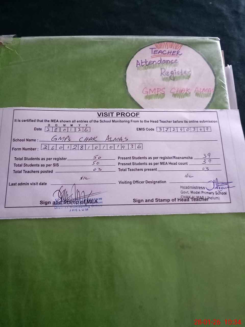 | Attendance Register | Head Teacher | MEA with School | Visit Proof |