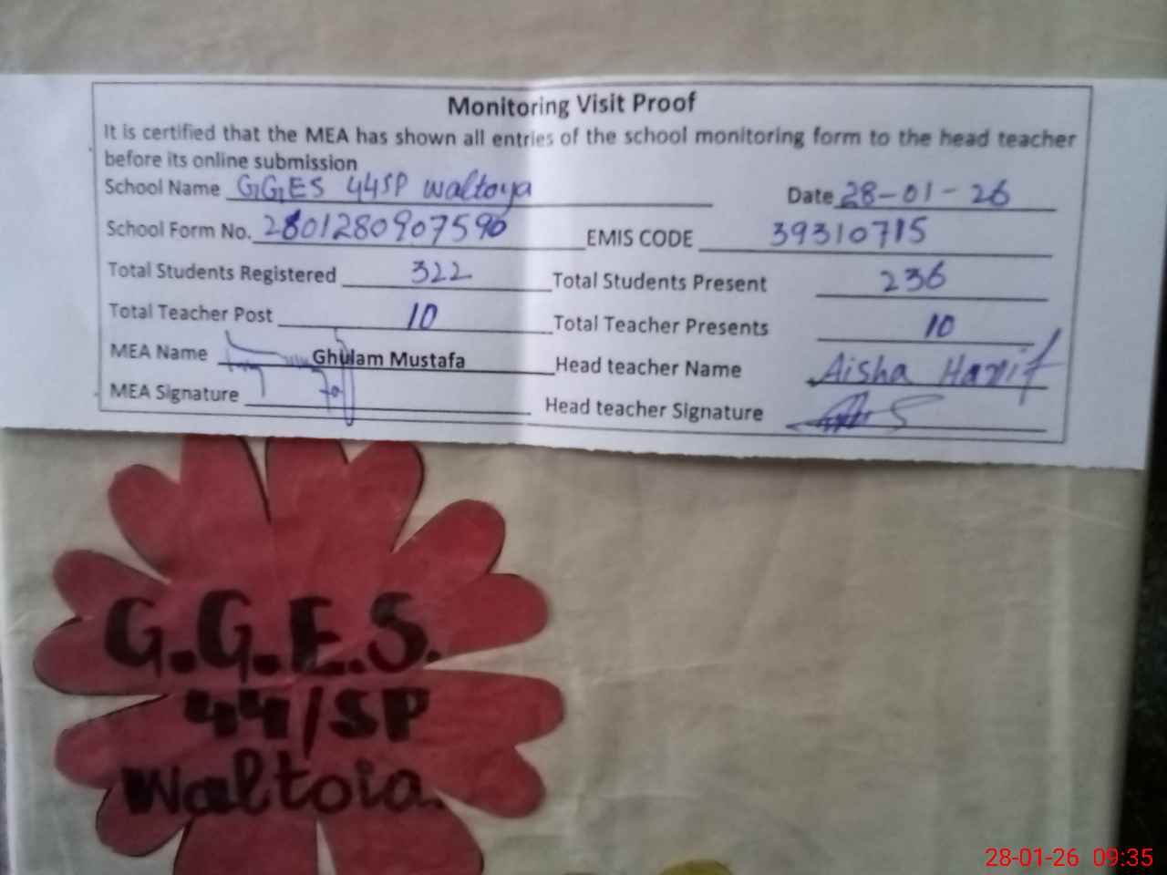 | Attendance Register | Head Teacher | MEA with School | Visit Proof |