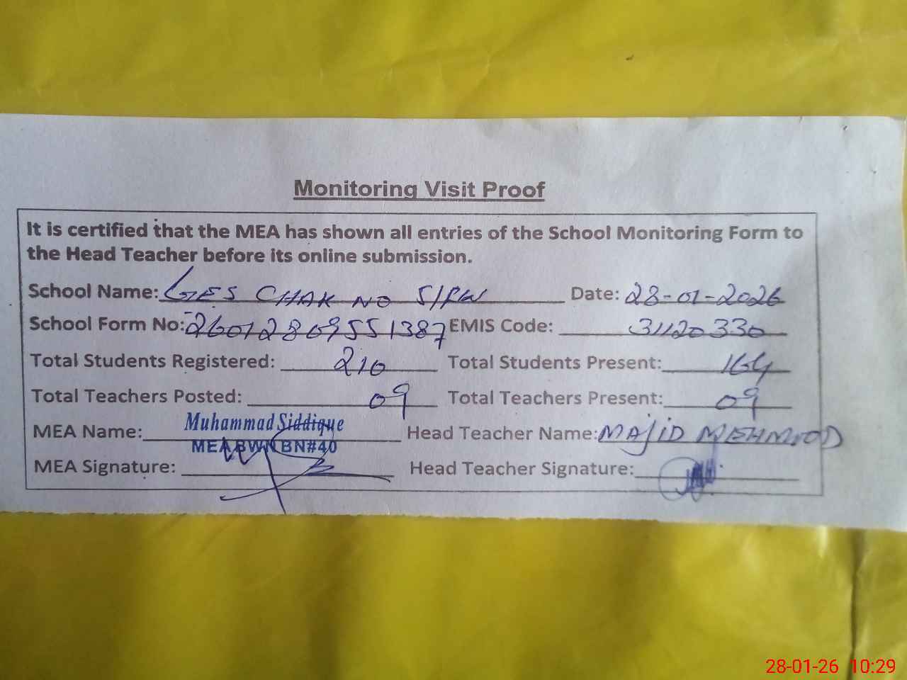 | Attendance Register | Head Teacher | MEA with School | Visit Proof |