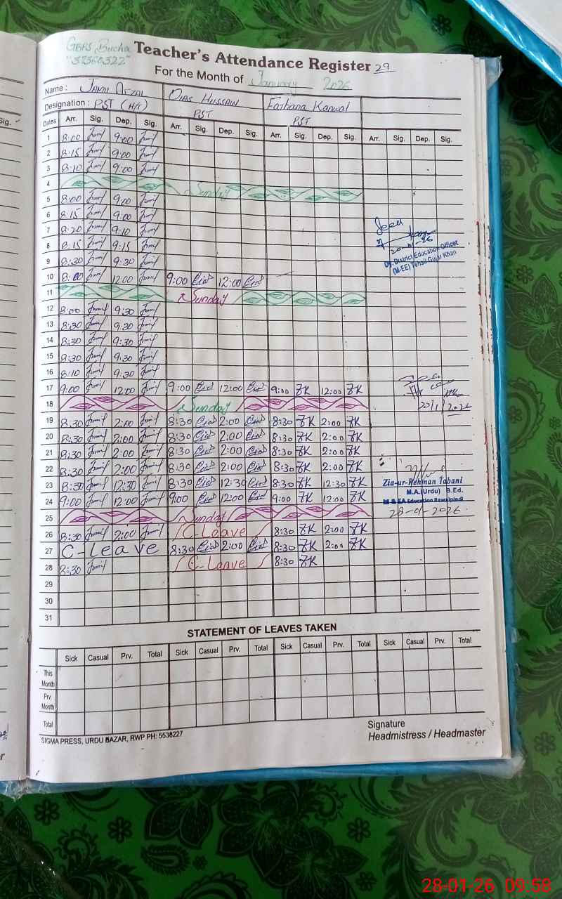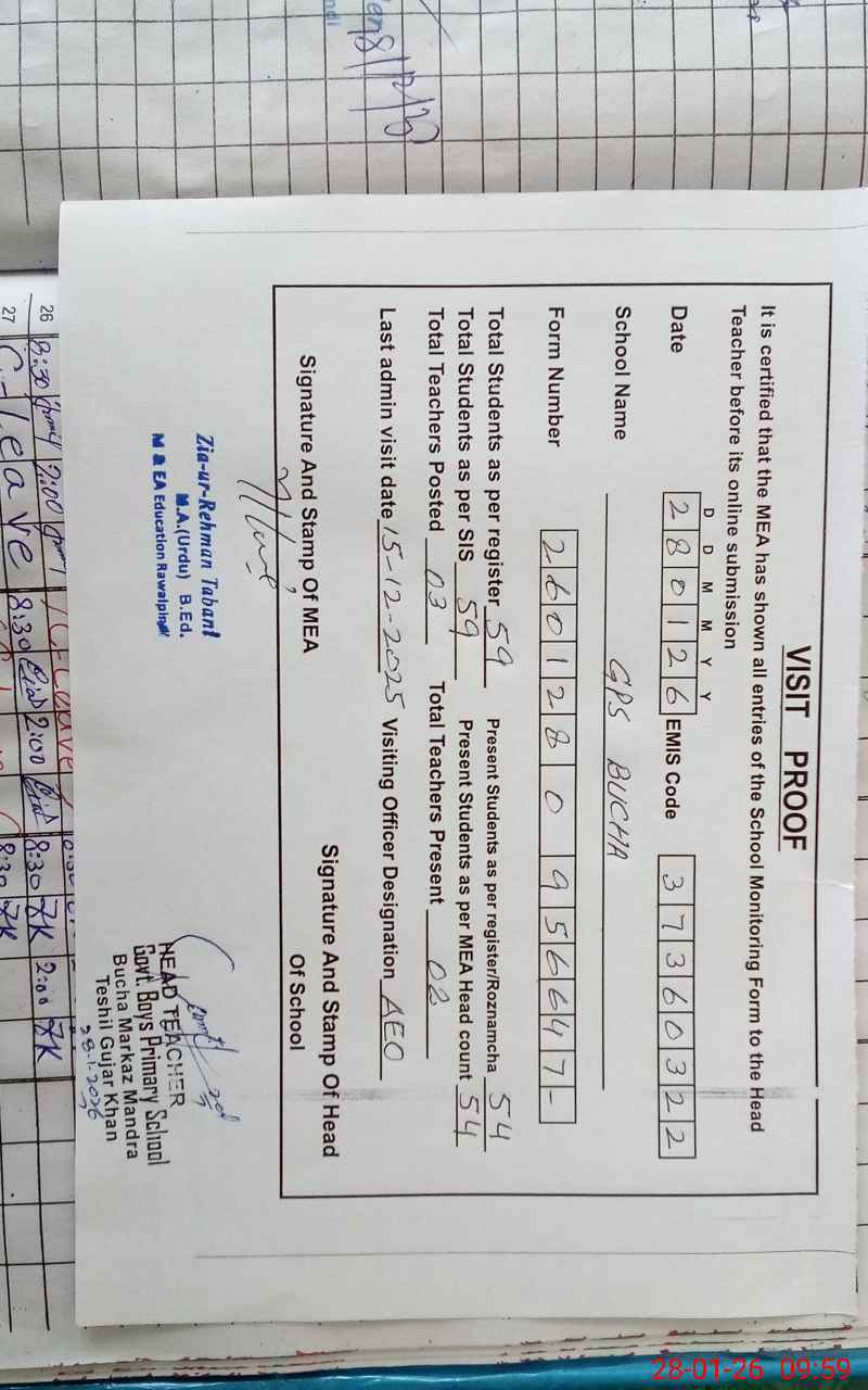 | Attendance Register | Head Teacher | MEA with School | Visit Proof |