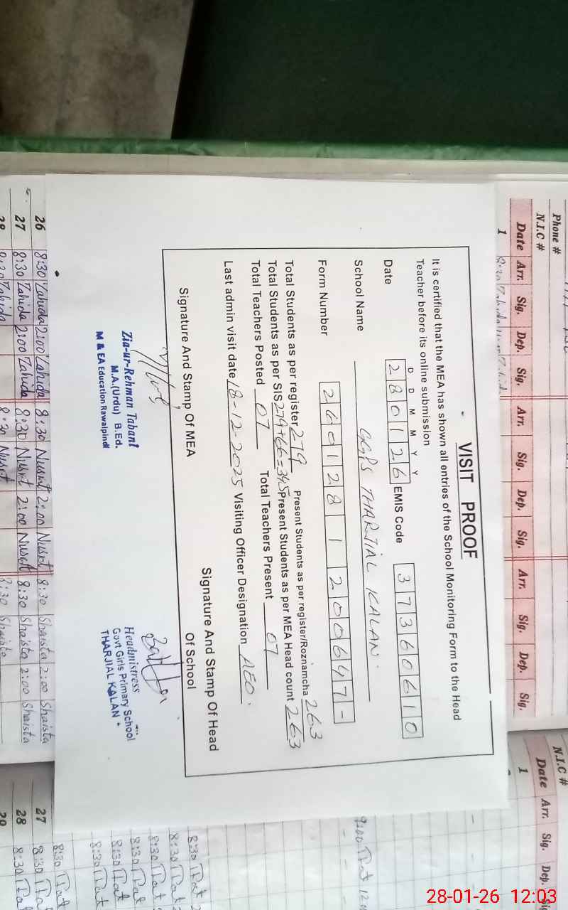 | Attendance Register | Head Teacher | MEA with School | Visit Proof |