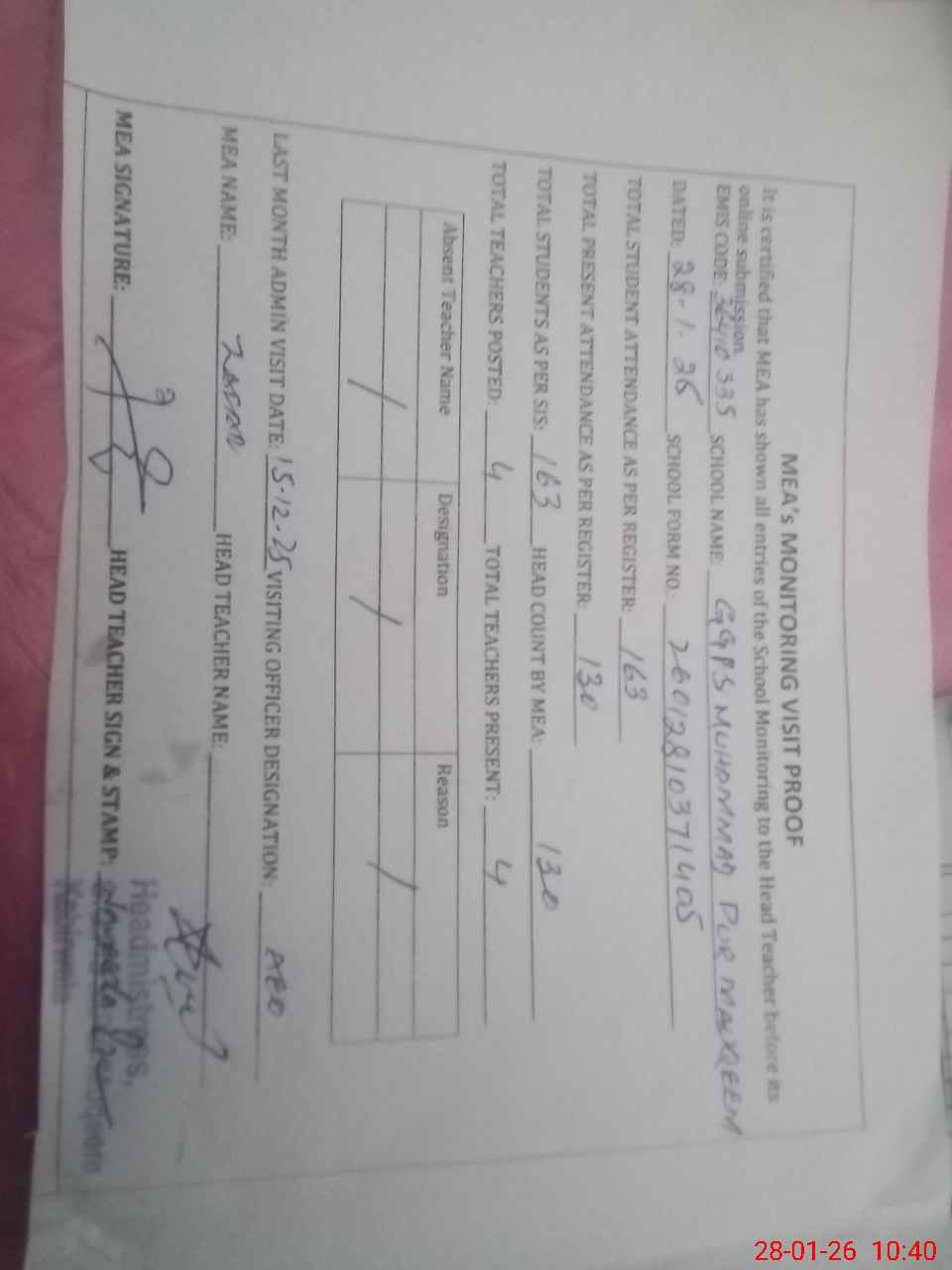 | Attendance Register | Head Teacher | MEA with School | Visit Proof |