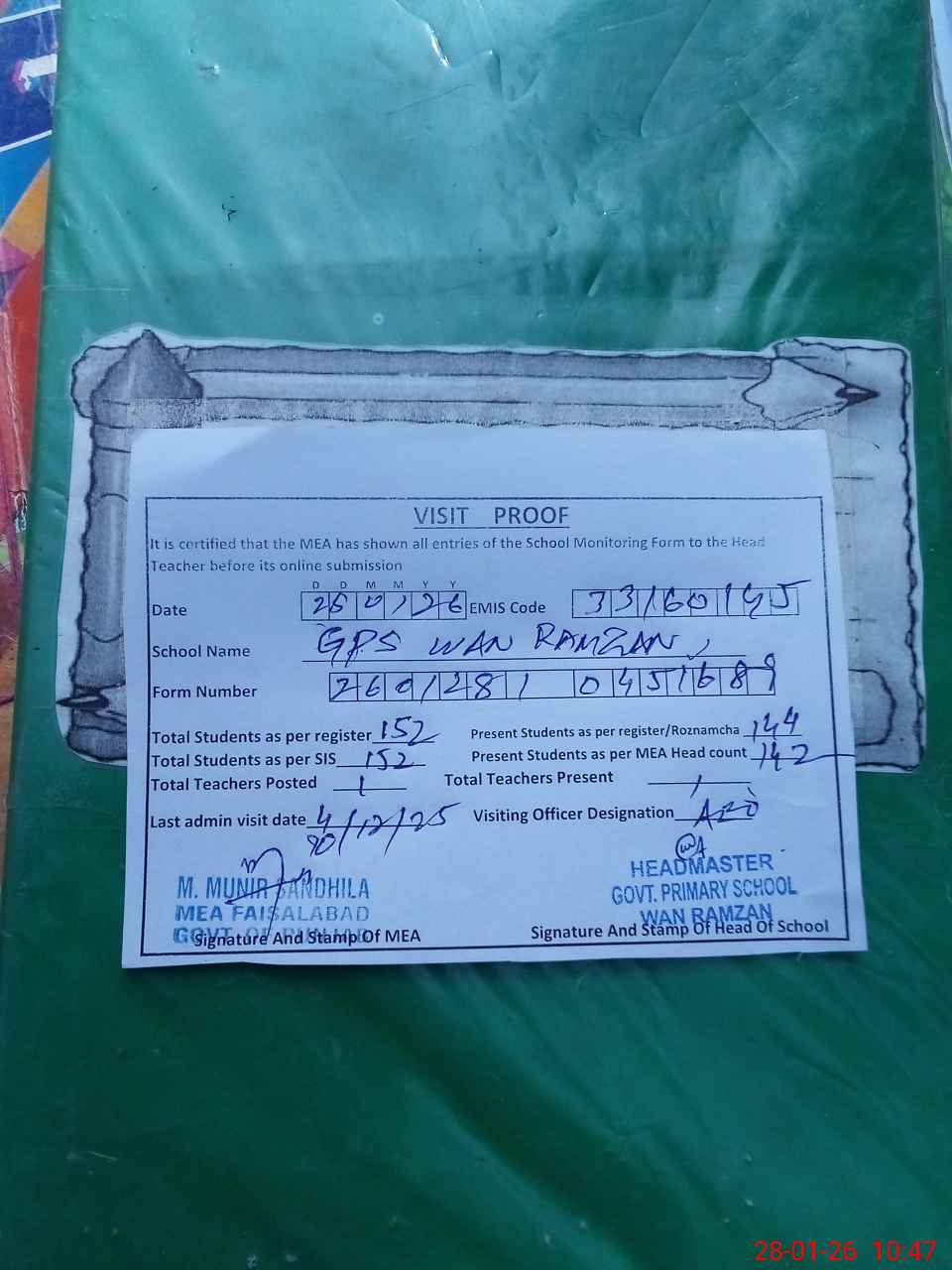 | EMIS Code: 33160145 | Name of School: GPS WAN RAMZAN TANDLIANWALA | |||
