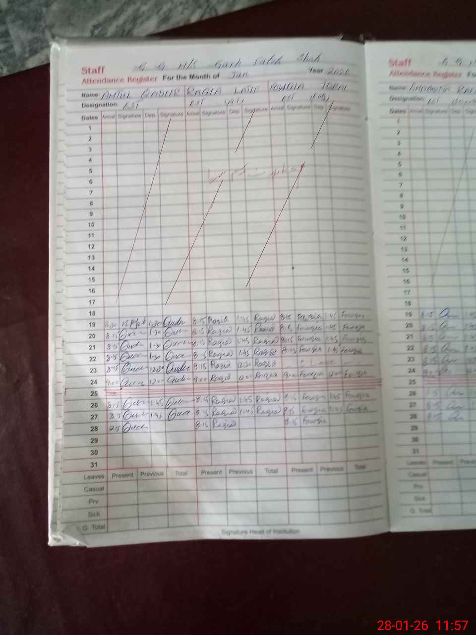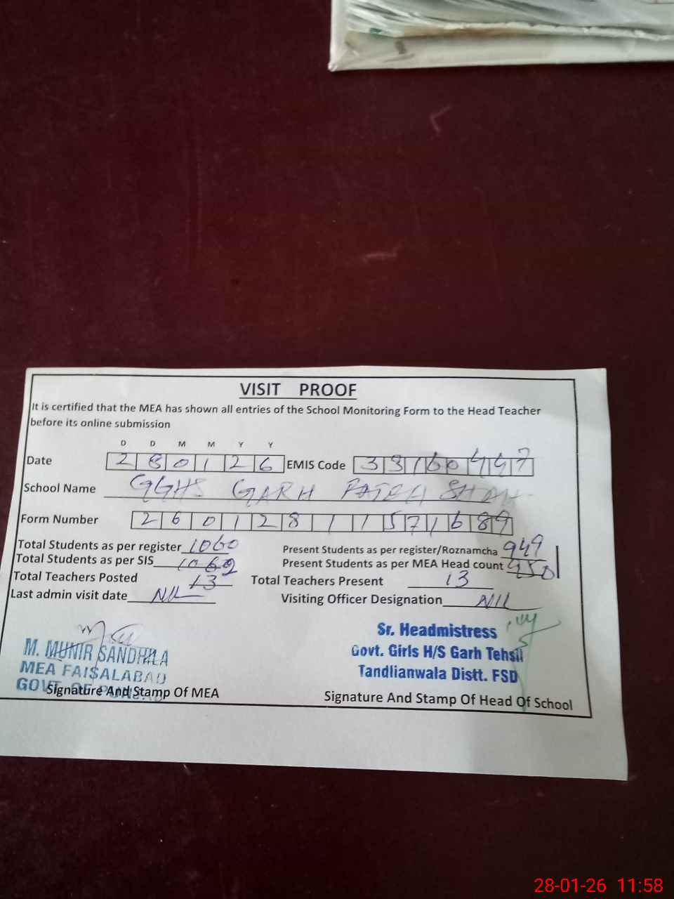 | Attendance Register | Head Teacher | MEA with School | Visit Proof |