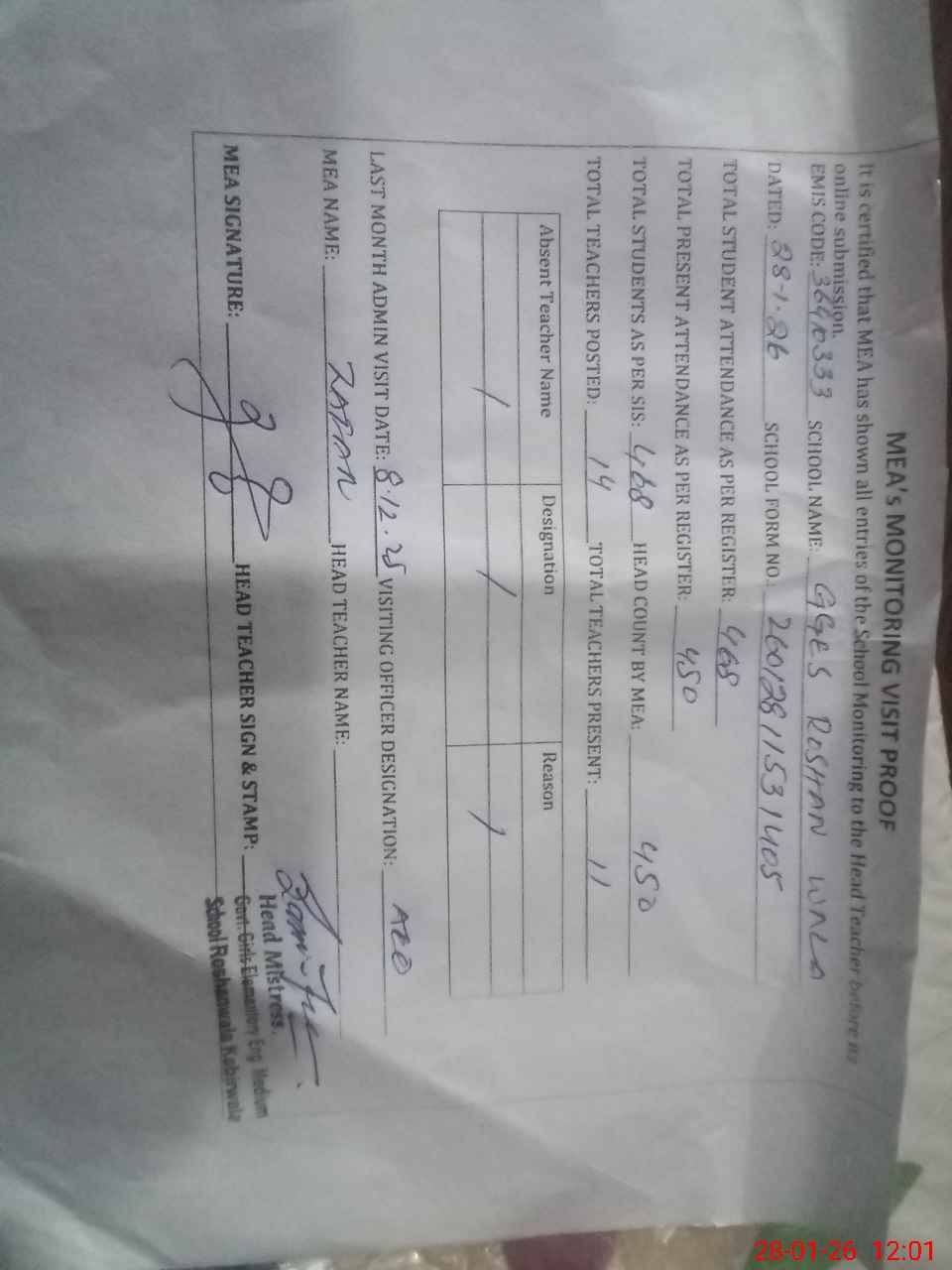 | Attendance Register | Head Teacher | MEA with School | Visit Proof |