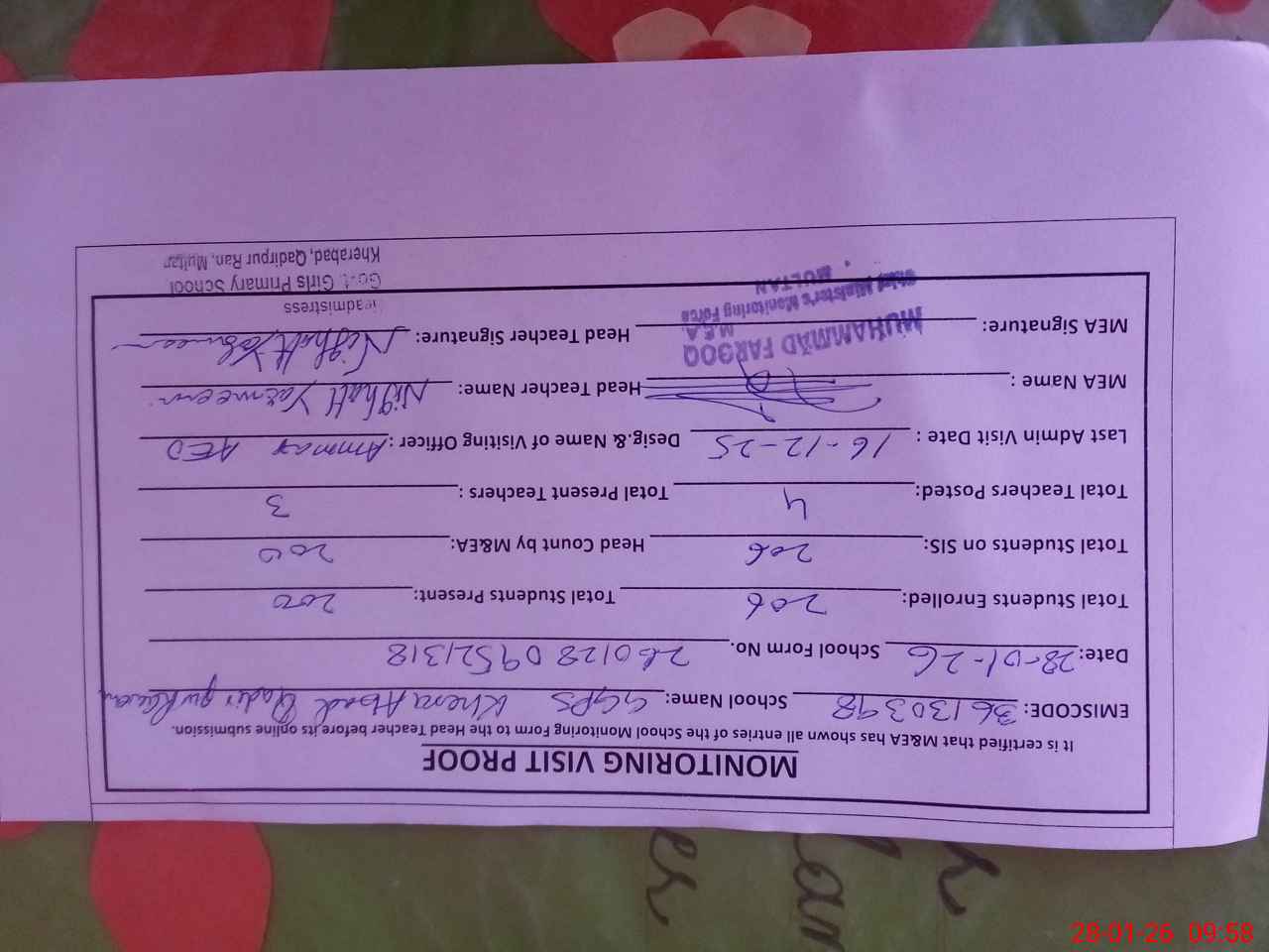 | Attendance Register | Head Teacher | MEA with School | Visit Proof |