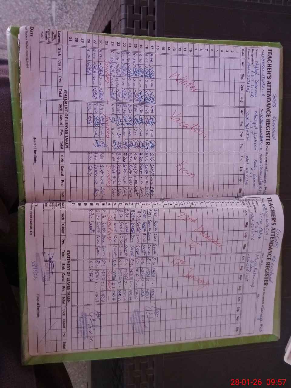 | Leave | Duty | Absent | Maternity | Medical | Ex- Pak |