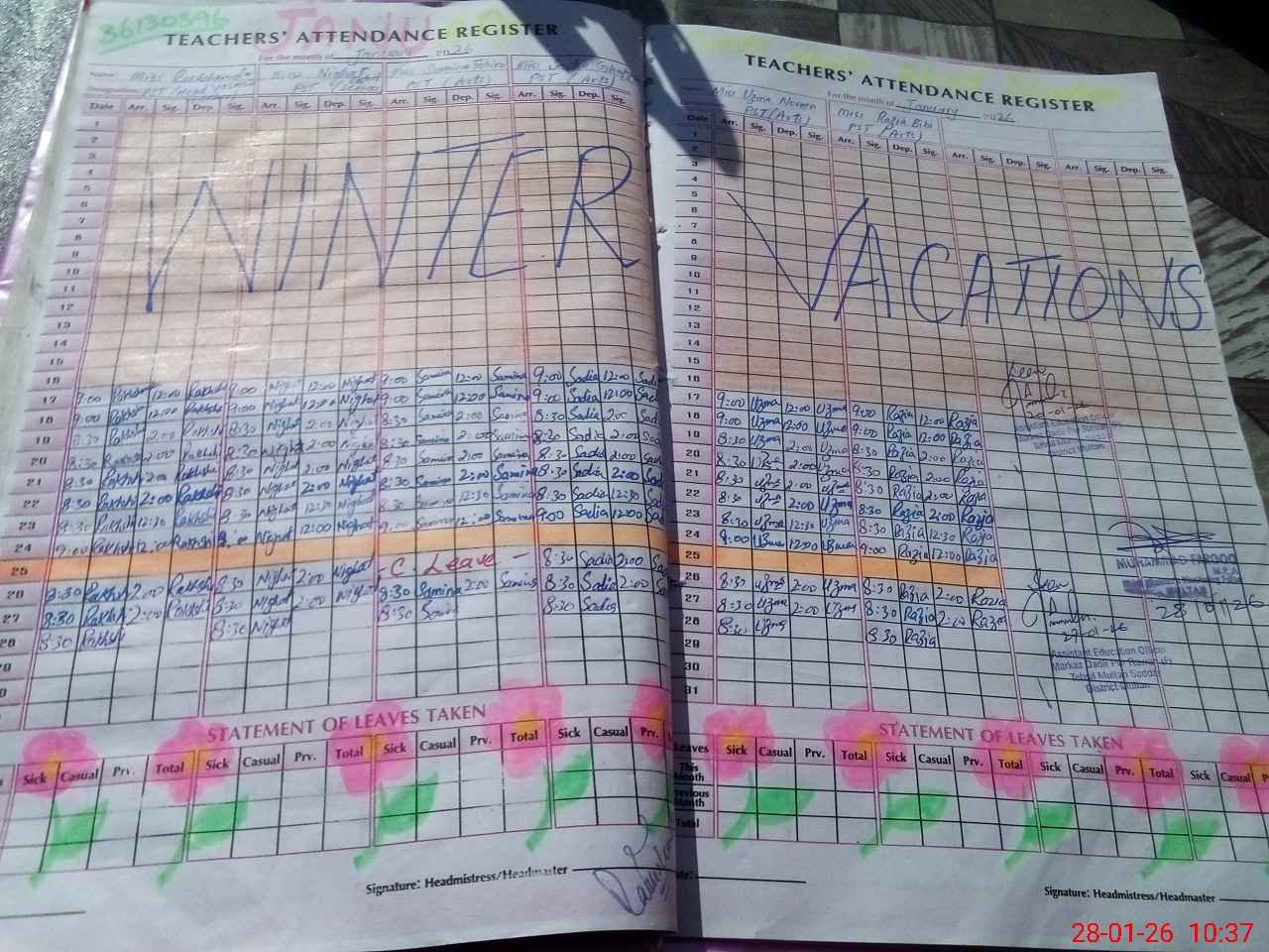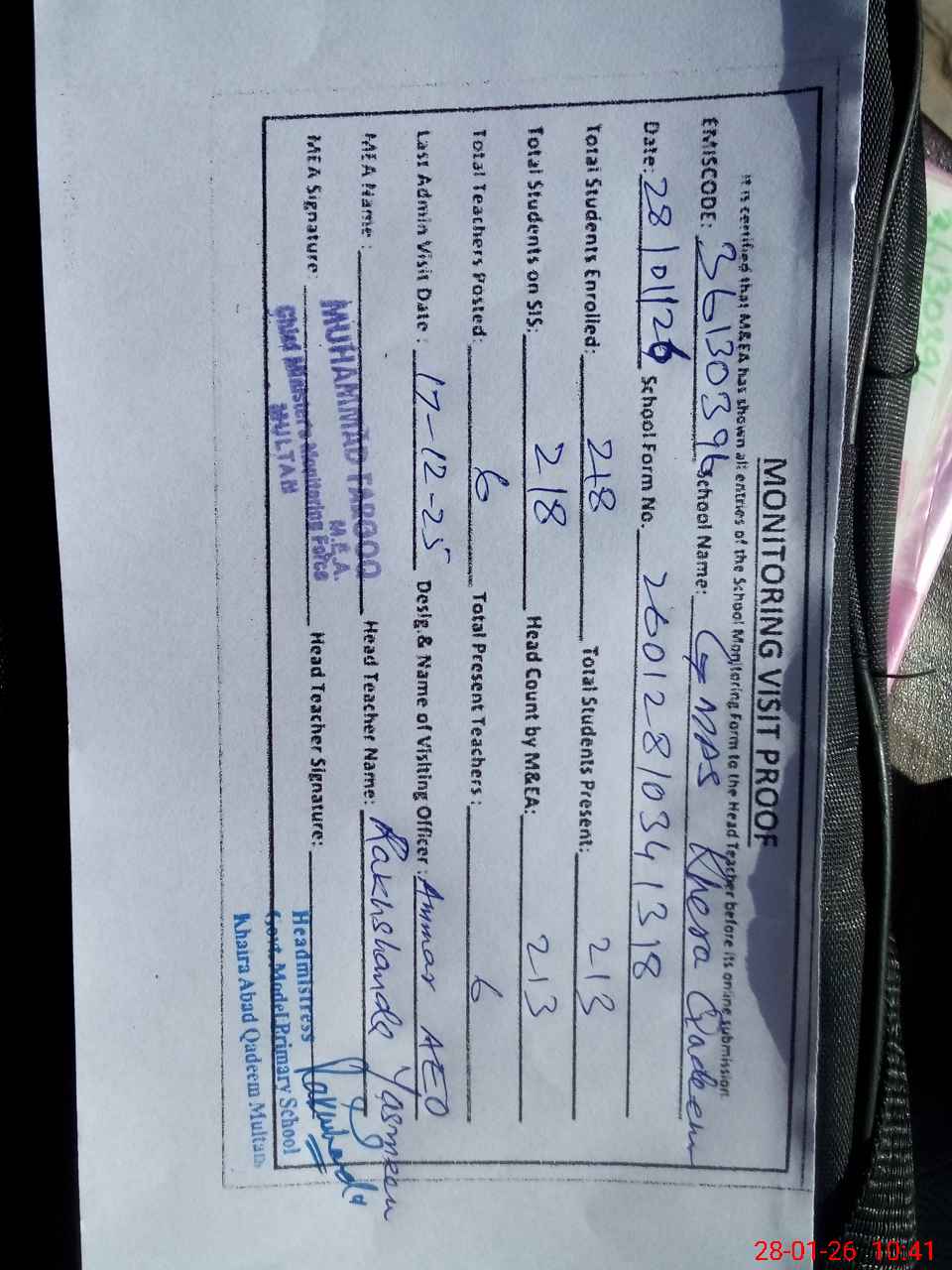 | Attendance Register | Head Teacher | MEA with School | Visit Proof |