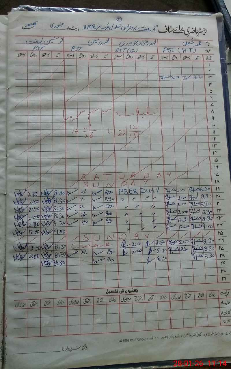 | CNIC | Full Name | Designation | R/C | Absence During Last Calender Month |