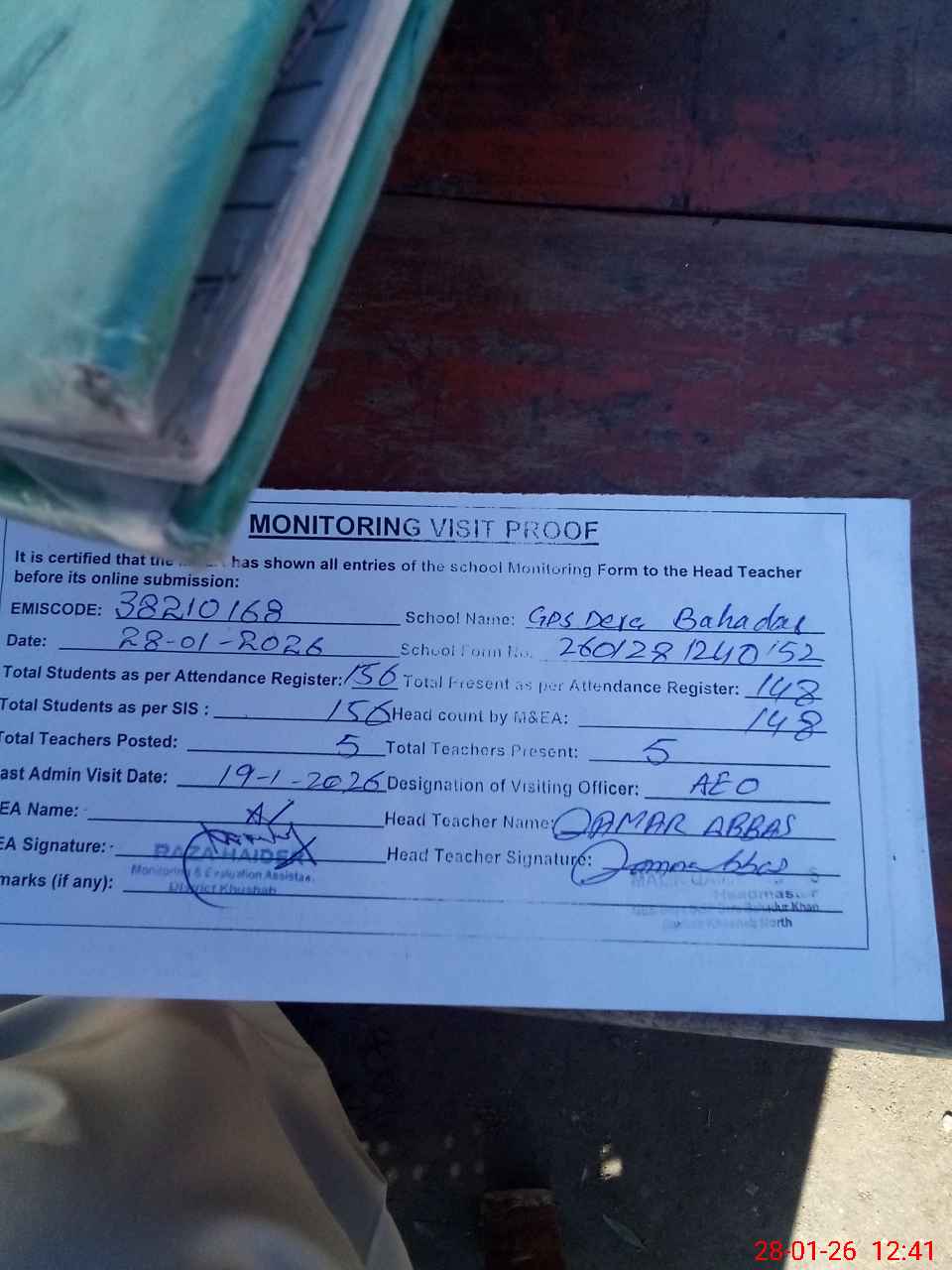 | Attendance Register | Head Teacher | MEA with School | Visit Proof |