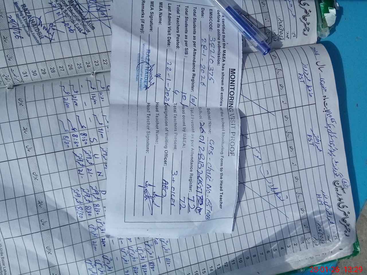 | Attendance Register | Head Teacher | MEA with School | Visit Proof |
