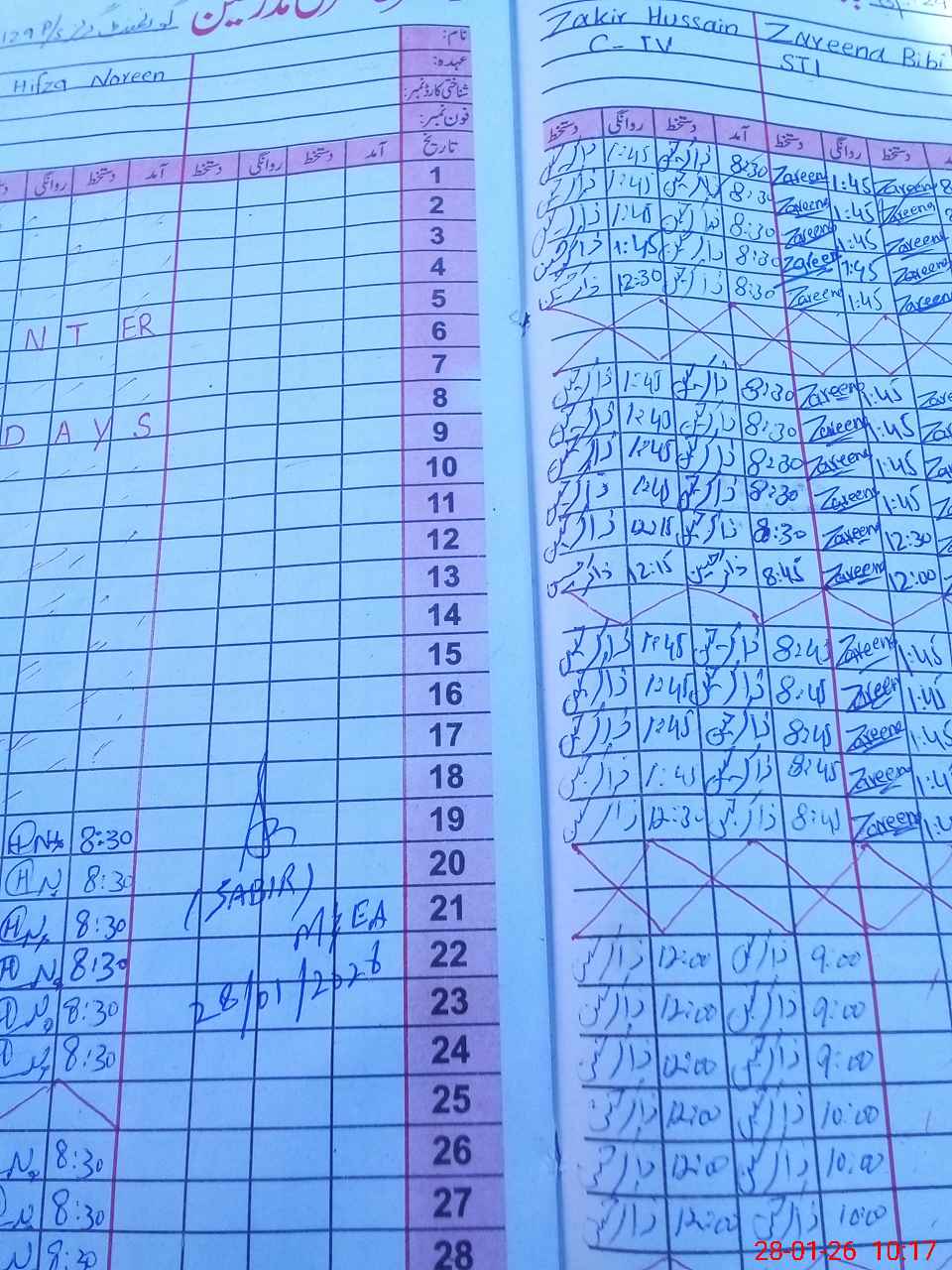 | CNIC | Full Name | Designation | R/C | Absence During Last Calender Month |