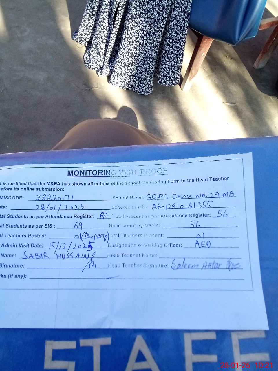 | Remarks (Use Separate Page if Required): no teacher absent total students on register 69 total students on SiS 69 Last admin visit by AEO on 15 Dec 2025 | |||||