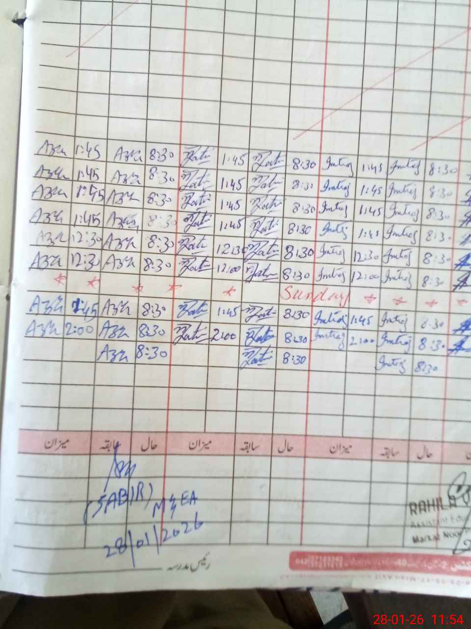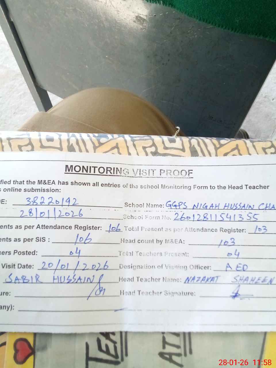 | Remarks (Use Separate Page if Required): no teacher absent total students on register 106 total students on SiS 106 Last admin visit by AEO on 20 Jan 2026 | |||||