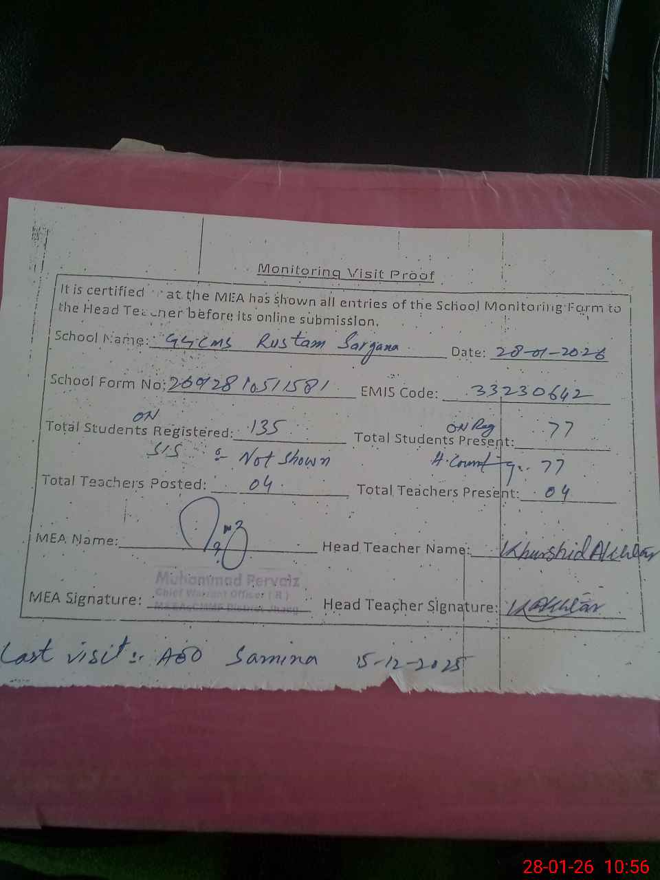 | Attendance Register | Head Teacher | MEA with School | Visit Proof |