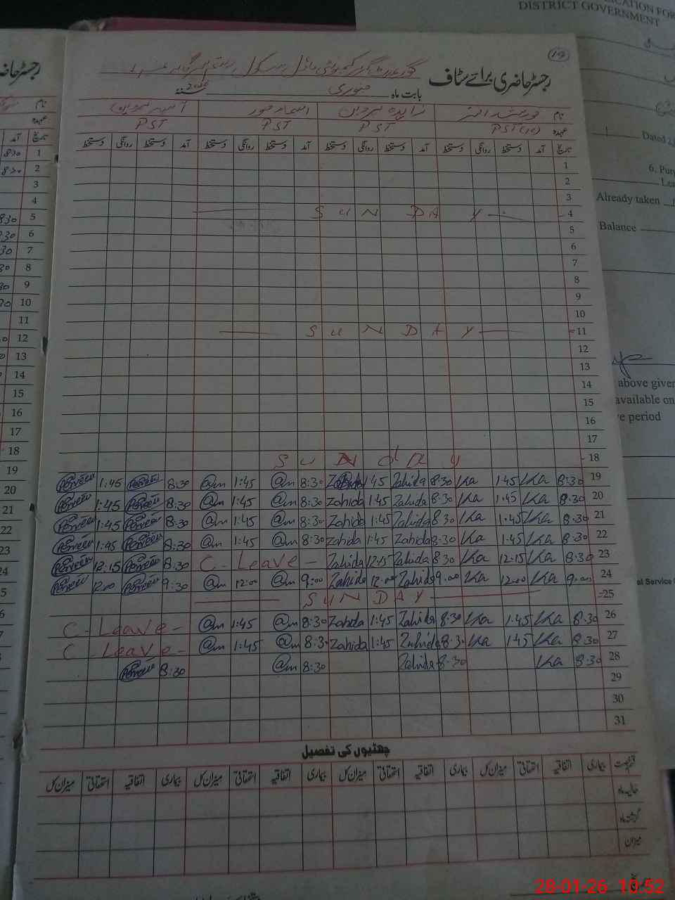 | CNIC | Full Name | Designation | R/C | Absence During Last Calender Month |