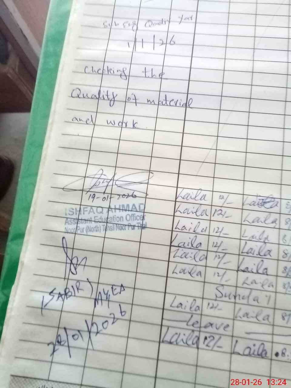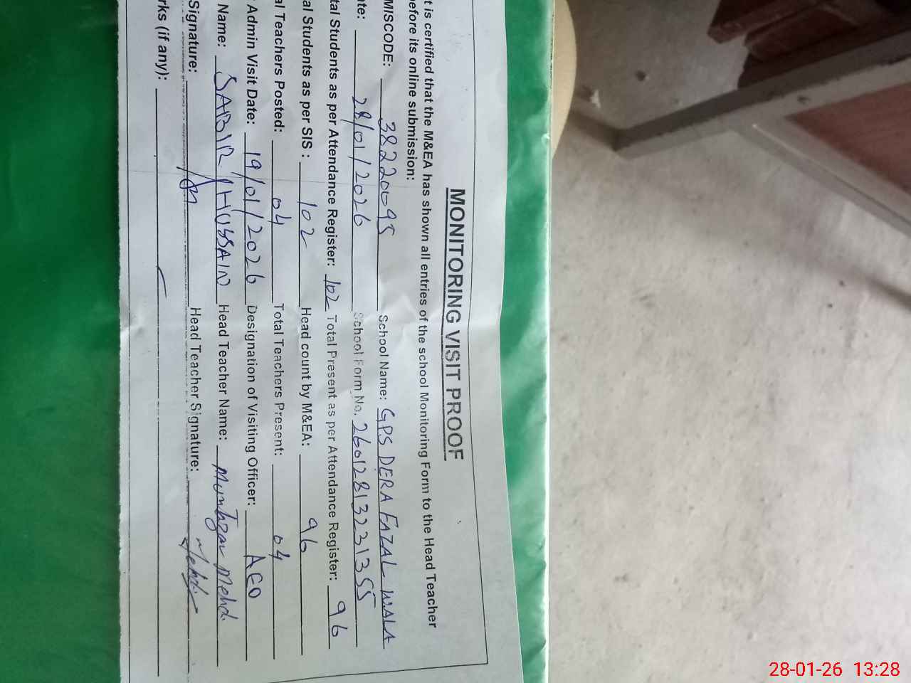 | Remarks (Use Separate Page if Required): no teacher absent total students on register 102 total students on SiS 102 Last admin visit by AEO on 19 Jan 2026 | |||||