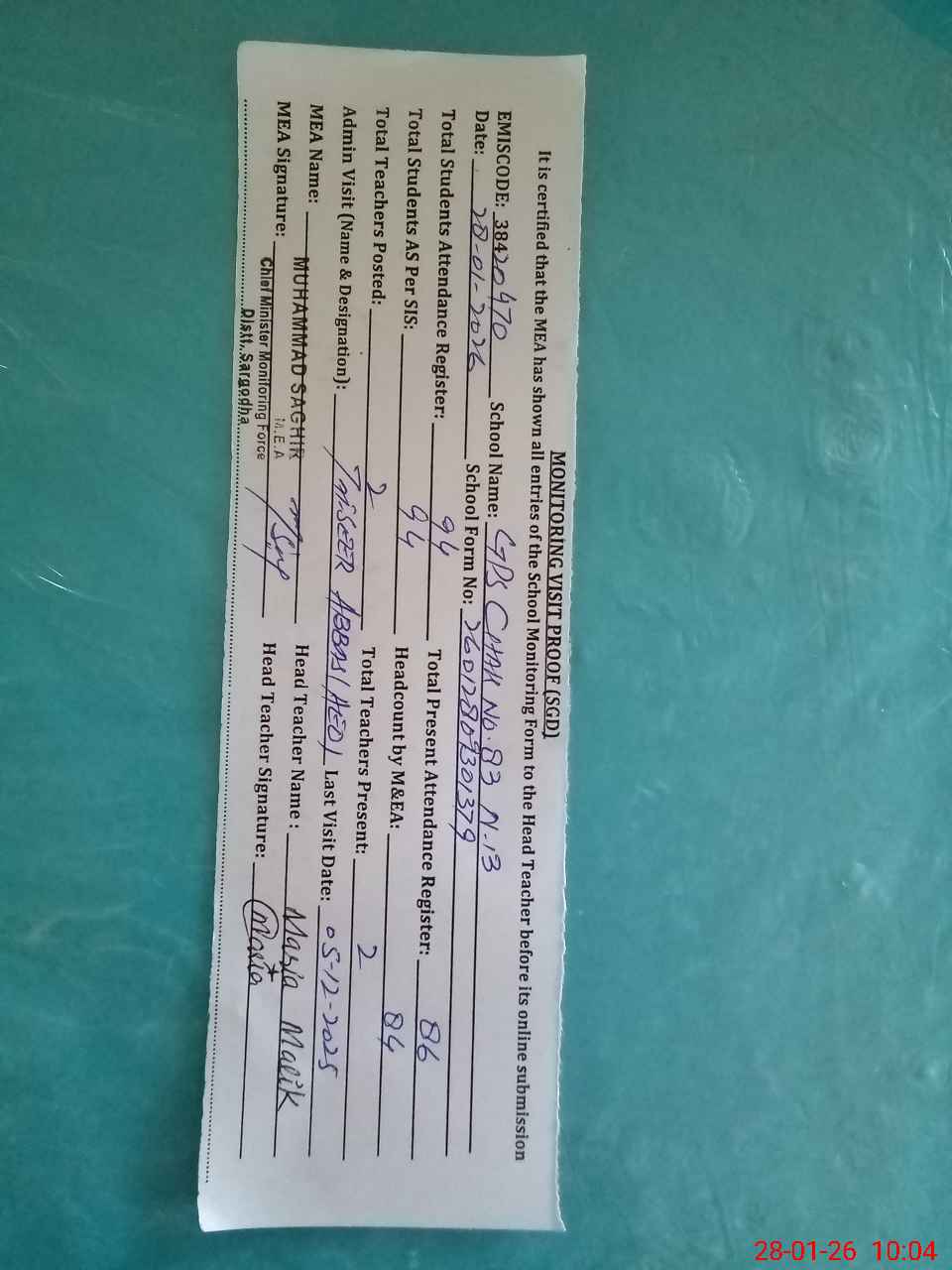 | Attendance Register | Head Teacher | MEA with School | Visit Proof |
