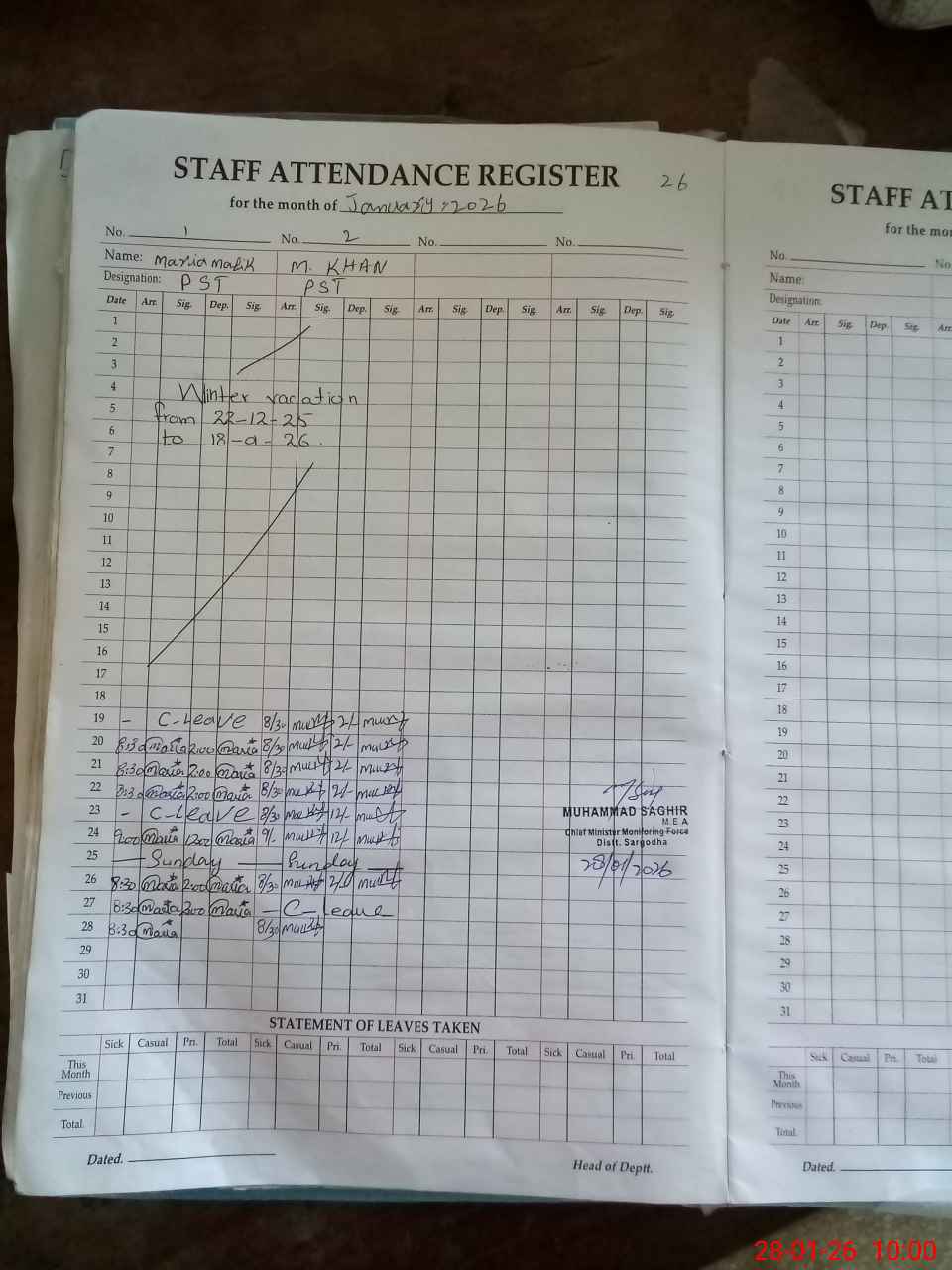 | Name: MU**** KH**** Designation: (School Headmaster's/Headmistress's) PST Phone/Cell Number: 03**** |