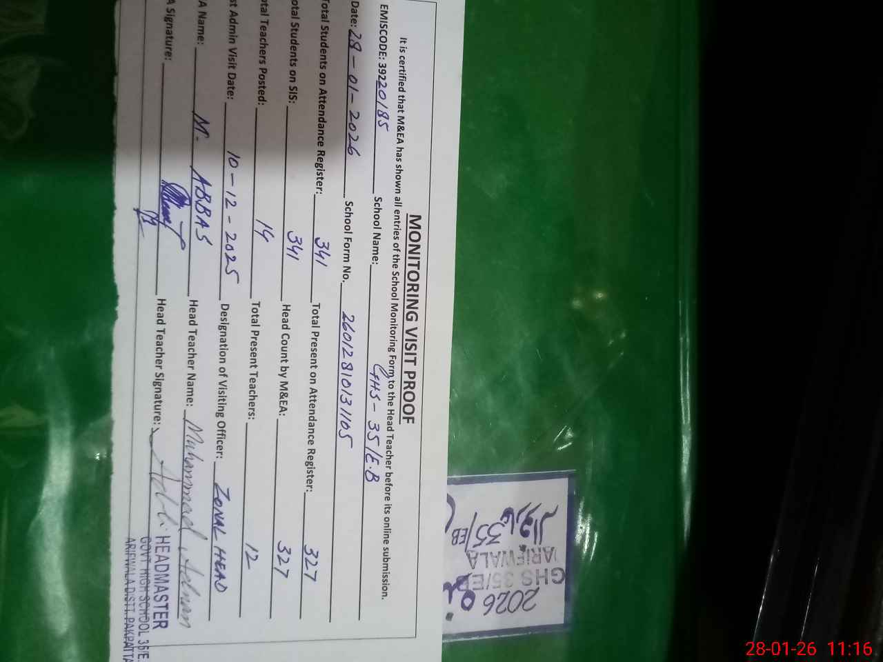 | EMIS Code: 39220185 | Name of School: GHS 35 EB ARIFWALA | |||