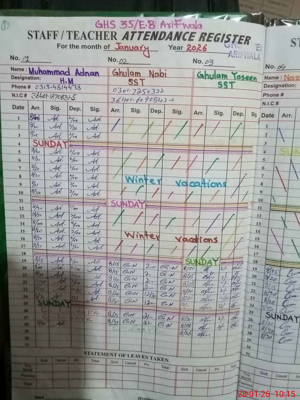 | CNIC | Full Name | Designation | R/C | Absence During Last Calender Month |