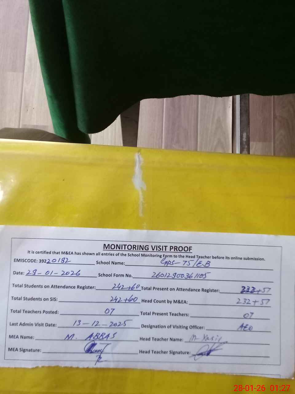 | Attendance Register | Head Teacher | MEA with School | Visit Proof |