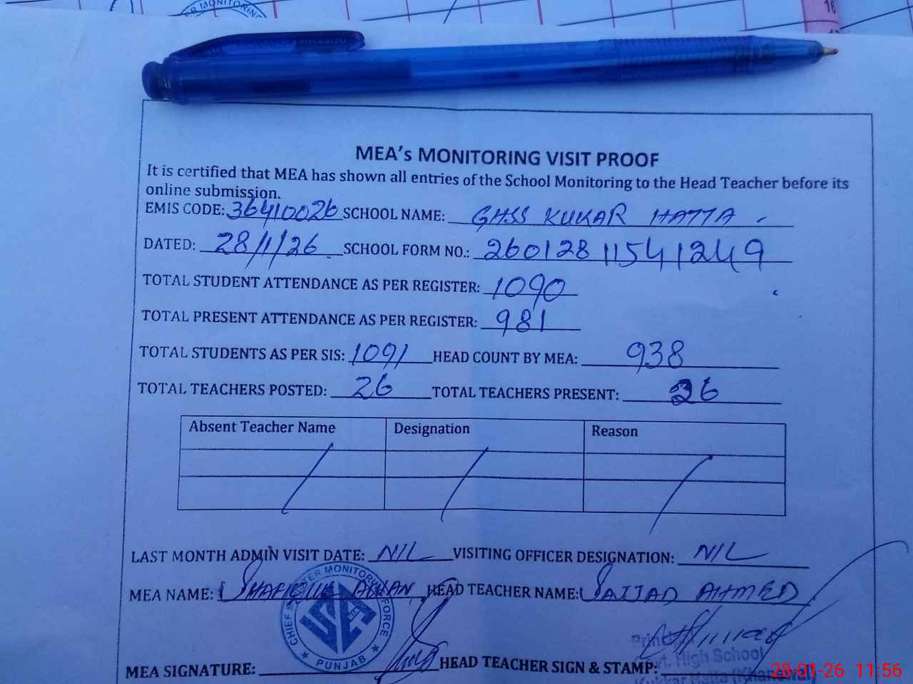 | Attendance Register | Head Teacher | MEA with School | Visit Proof |