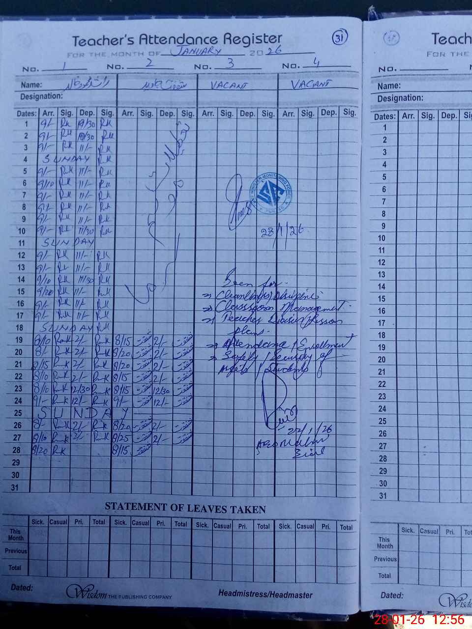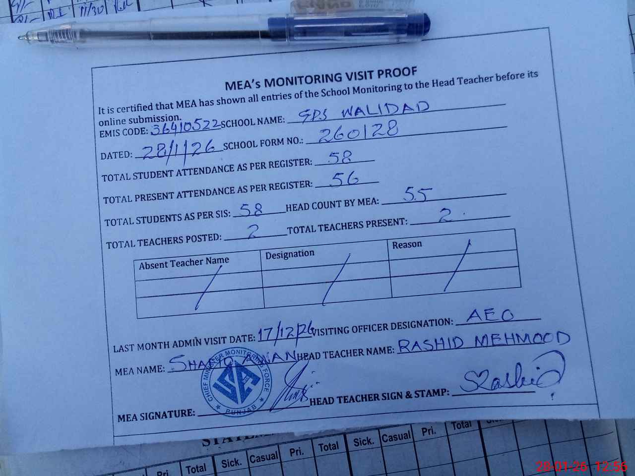| Attendance Register | Head Teacher | MEA with School | Visit Proof |