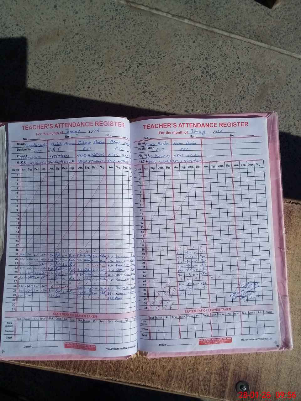 | CNIC | Full Name | Designation | R/C | Absence During Last Calender Month |