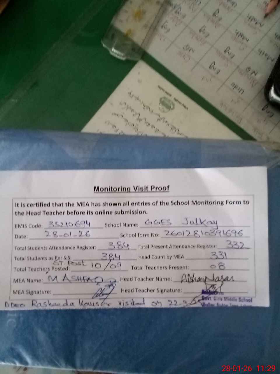 | Remarks (Use Separate Page if Required): AEO Shumaila Hameed last visited on 11-12-25 DDEO Rasheeda Kauser visited on 22-03-25 School has total 12 rooms while 02 classrooms not in use due to looking so poor condition cracks are looking on walls and roofs No barbed wire installed on the boundary walls while the height is only 4 to 5 feets PST Nazia Ramzan applied earned leave from 26-01-26 to 09-02-26 but her leave still waiting for approval from DDEO do mark him absent Cracks are looking on the front boundary wall 35210694 | |||||