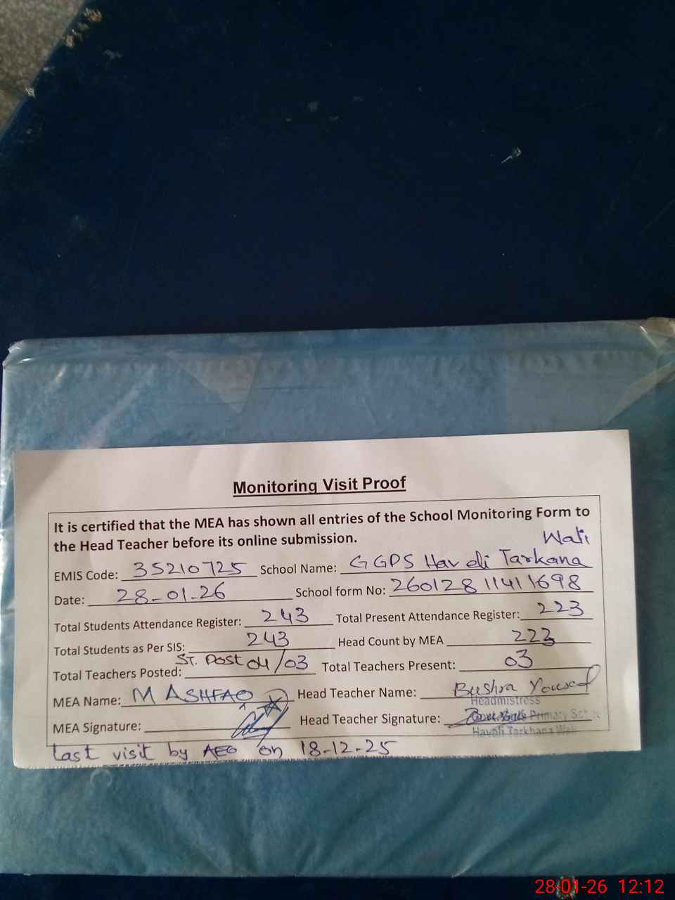 | Remarks (Use Separate Page if Required): School received fund 1250000 rupees for construction of 01 new classroom while 847000 rupees are consumed and construction work in progress Last visited by AEO on 18-12-25 35210725 | |||||