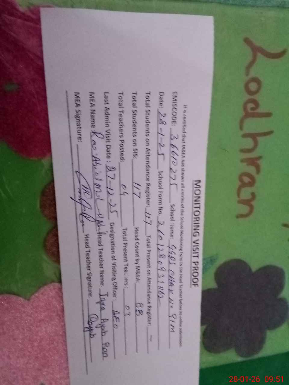 | Attendance Register | Head Teacher | MEA with School | Visit Proof |