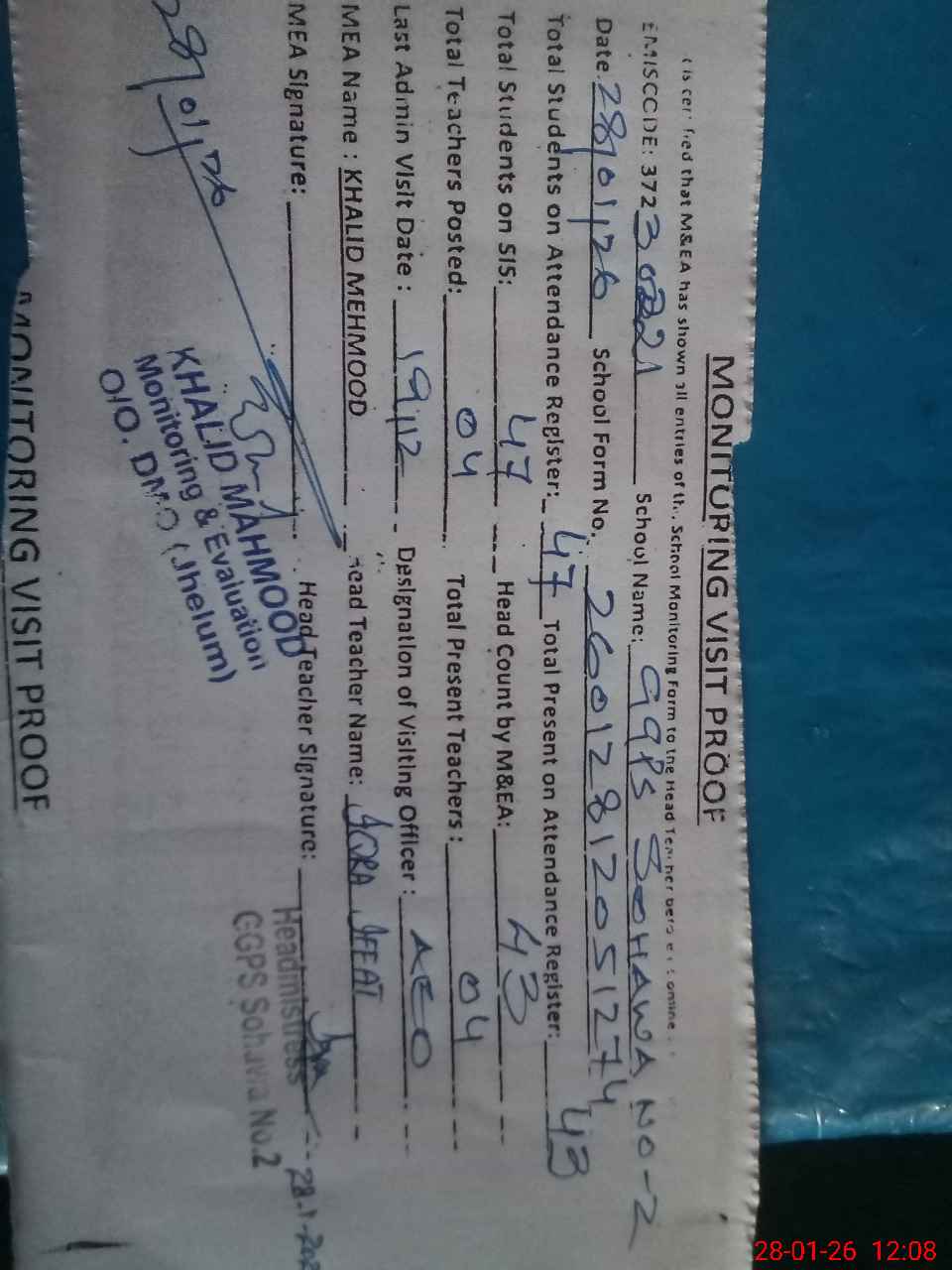 | Attendance Register | Head Teacher | MEA with School | Visit Proof |
