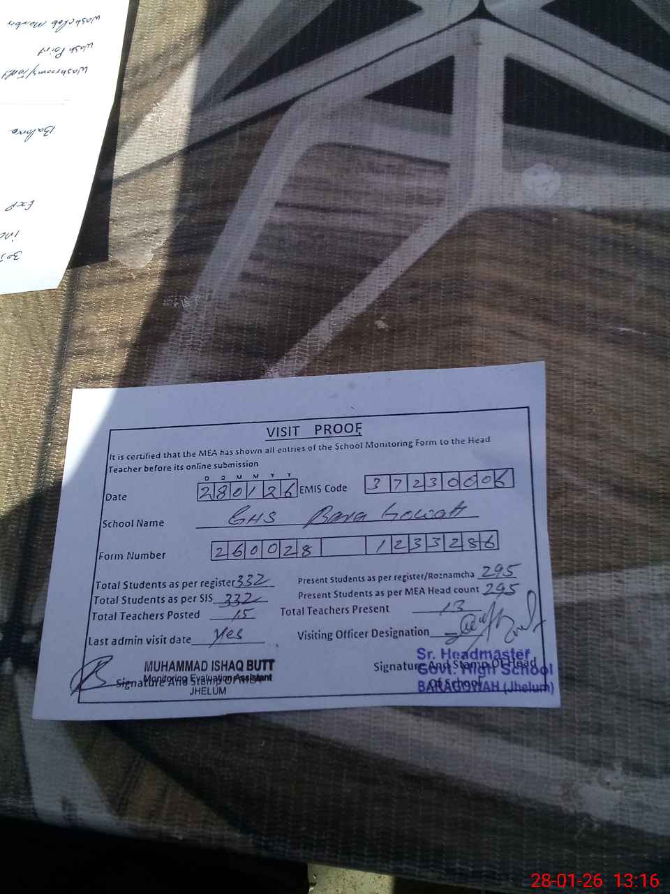 | Attendance Register | Head Teacher | MEA with School | Visit Proof |