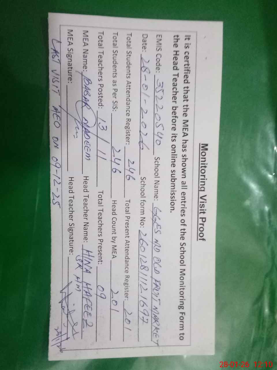 | Attendance Register | Head Teacher | MEA with School | Visit Proof |