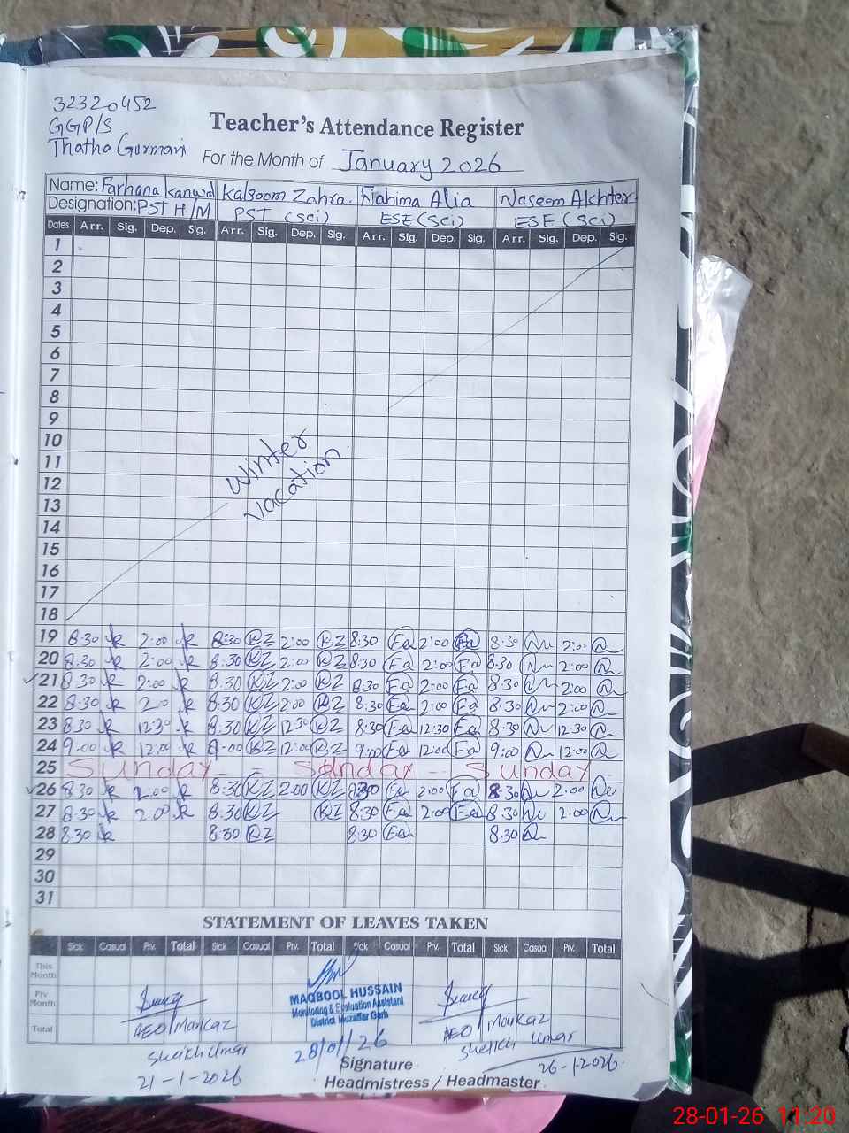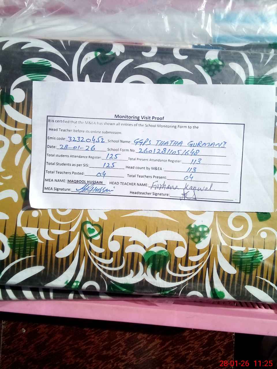 | Attendance Register | Head Teacher | MEA with School | Visit Proof |