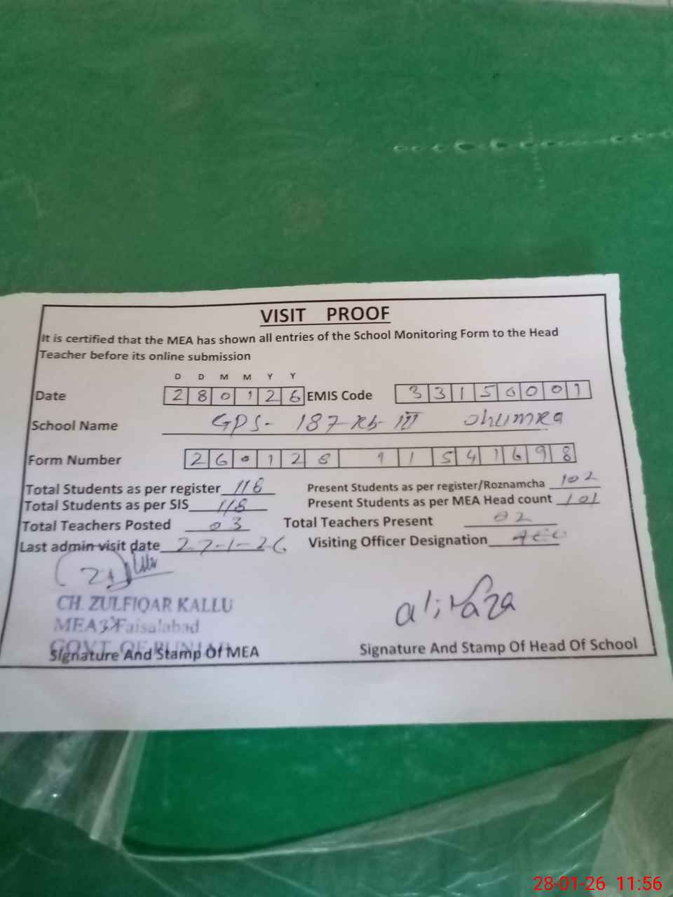 | Attendance Register | Head Teacher | MEA with School | Visit Proof |