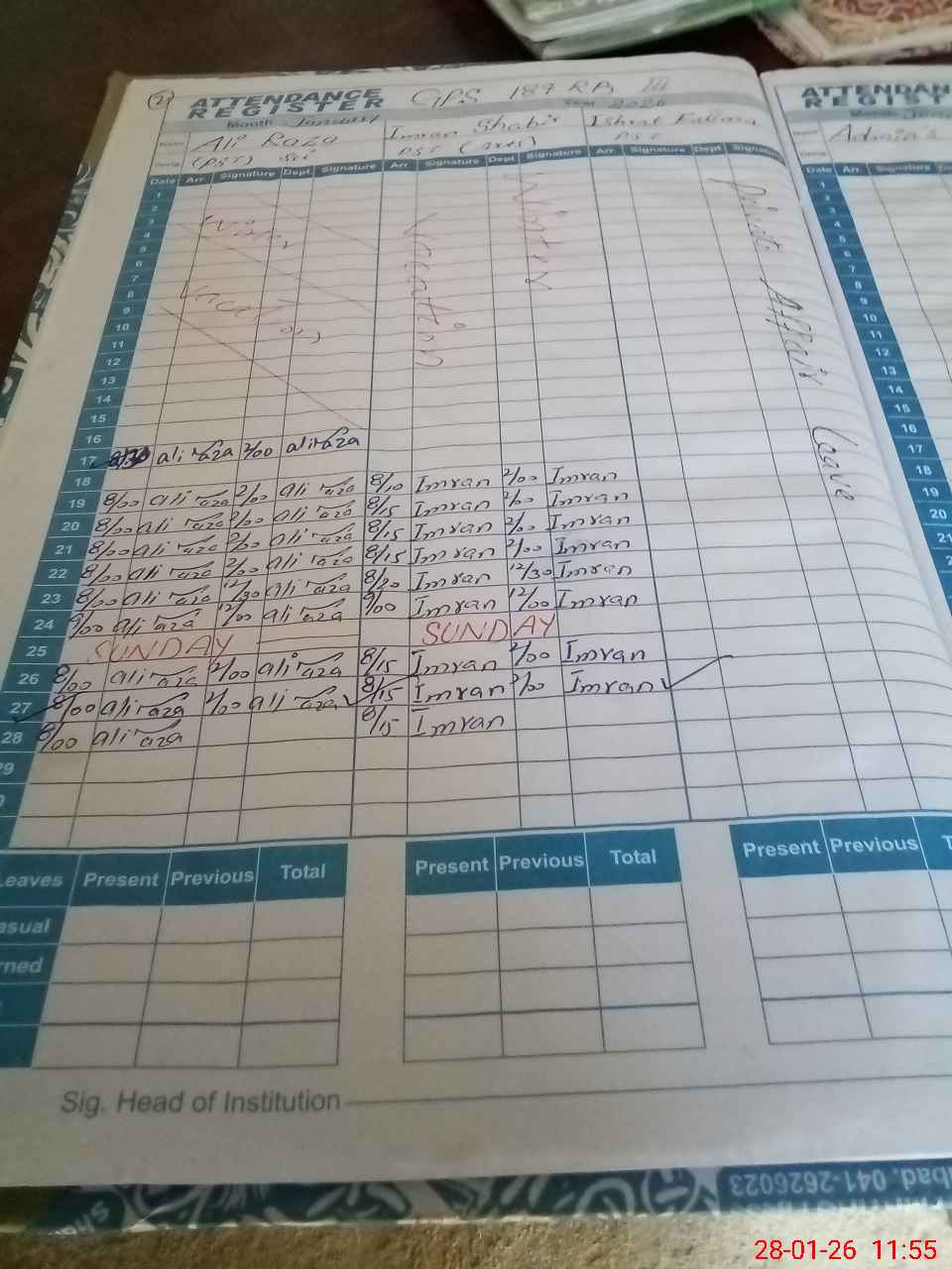 | Leave | Duty | Absent | Maternity | Medical | Ex- Pak |