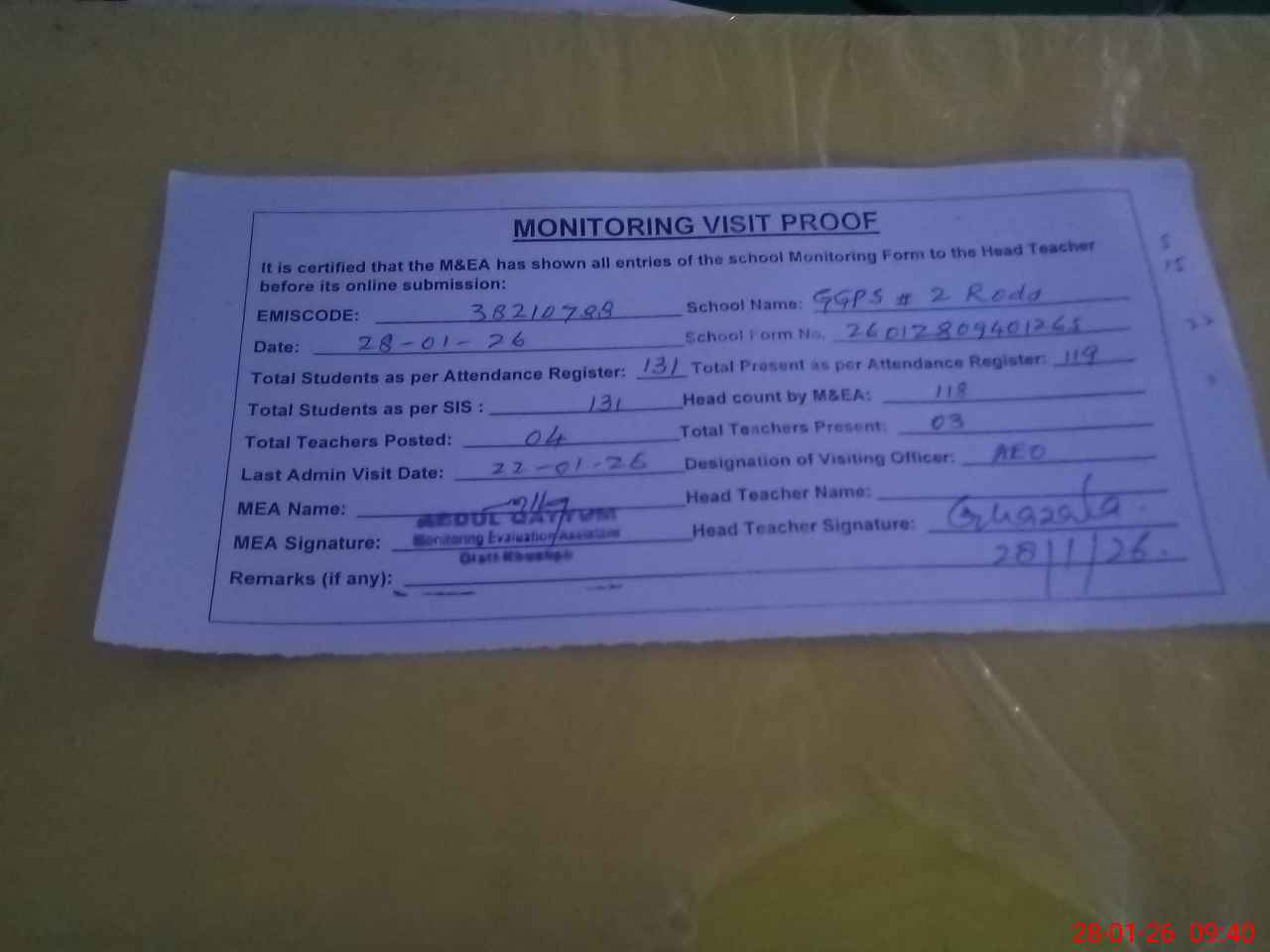 | Attendance Register | Head Teacher | MEA with School | Visit Proof |
