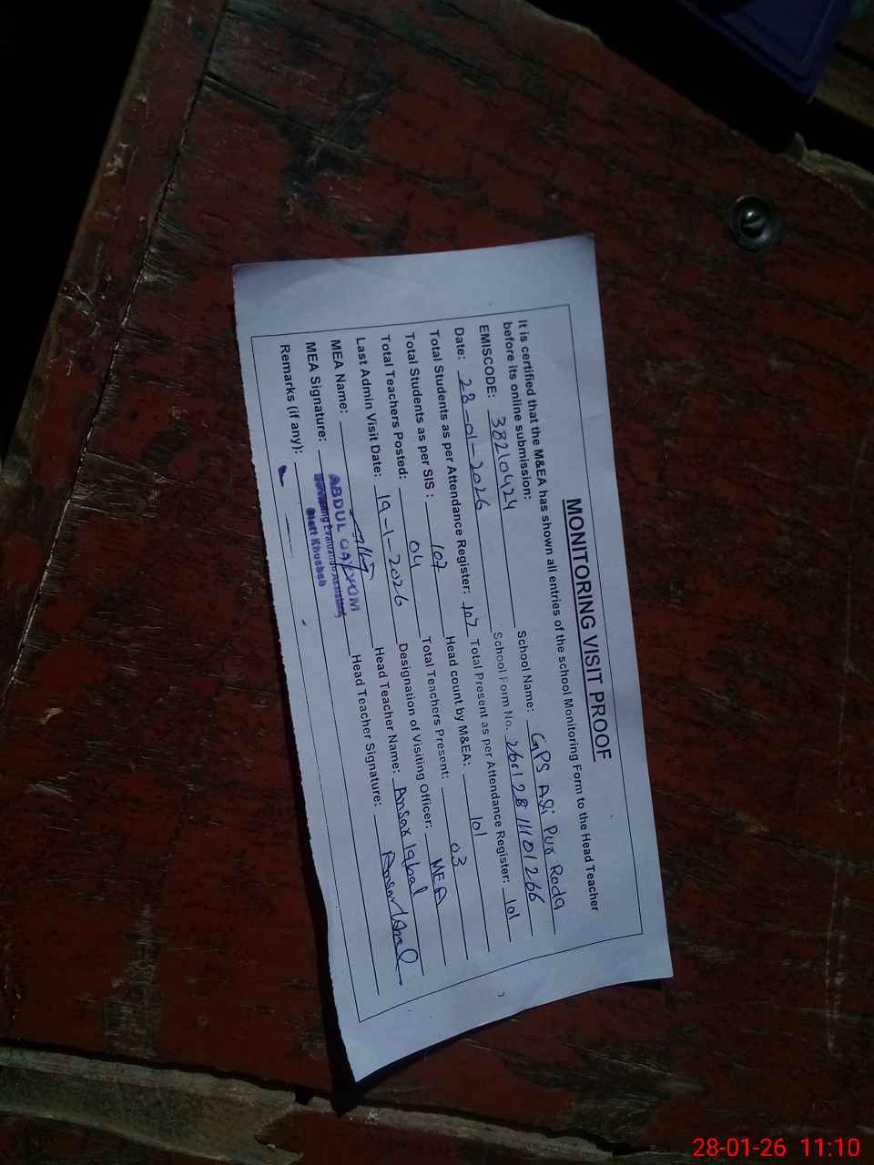 | Attendance Register | Head Teacher | MEA with School | Visit Proof |