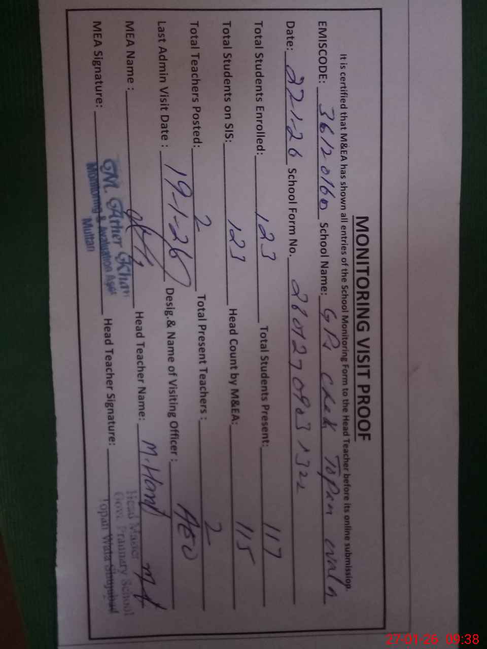 | Attendance Register | Head Teacher | MEA with School | Visit Proof |
