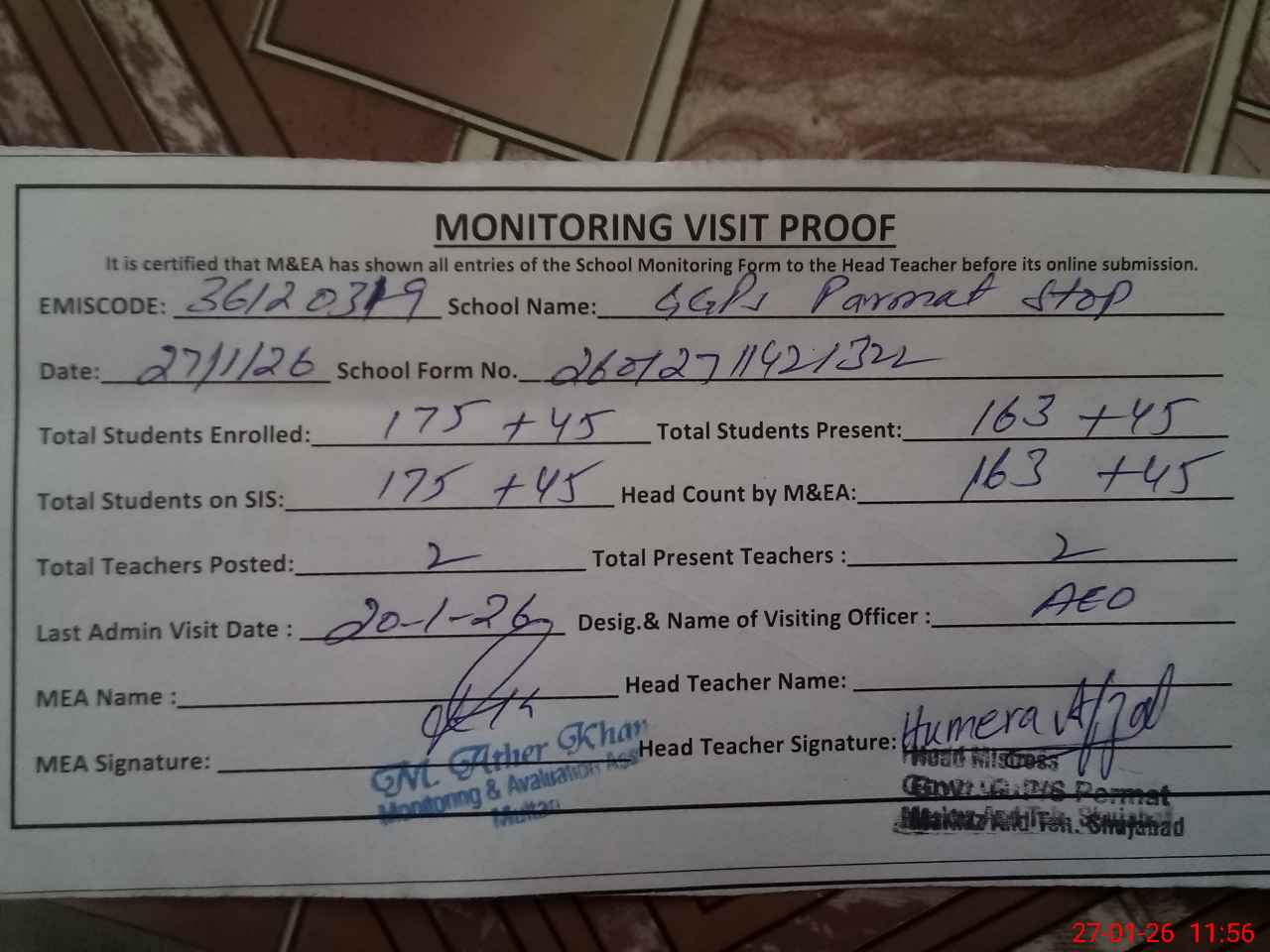 | Attendance Register | Head Teacher | MEA with School | Visit Proof |