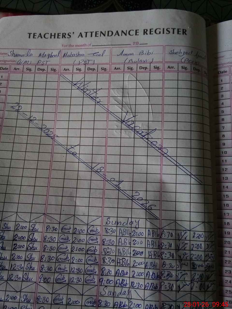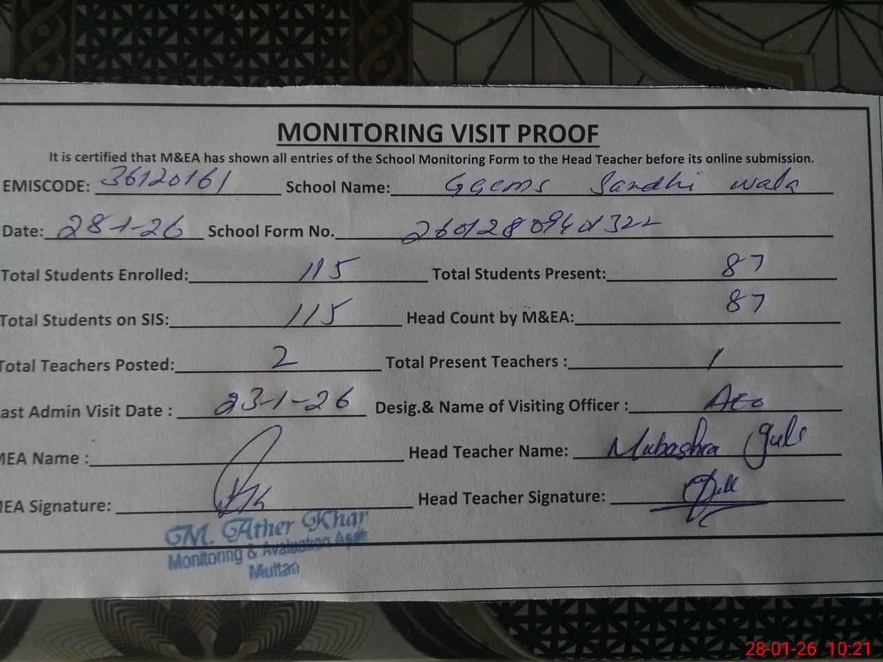 | Attendance Register | Head Teacher | MEA with School | Visit Proof |