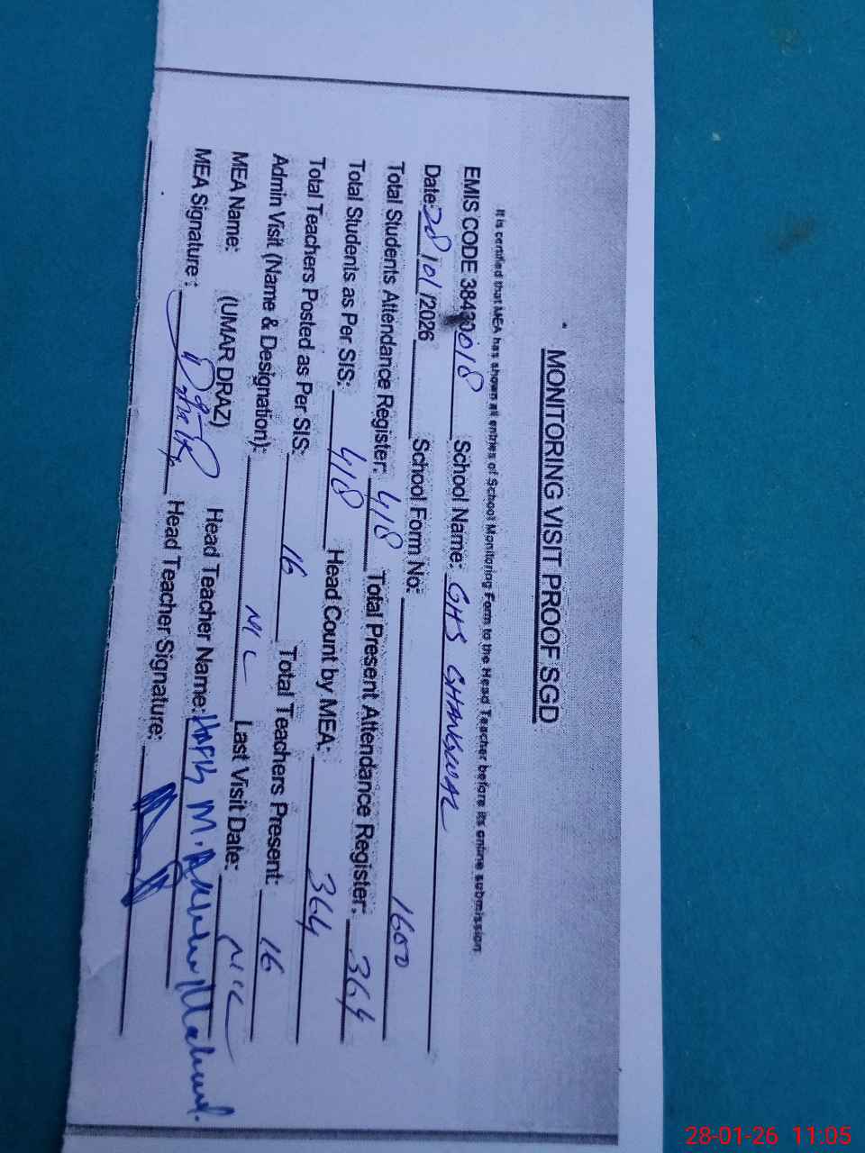 | Attendance Register | Head Teacher | MEA with School | Visit Proof |