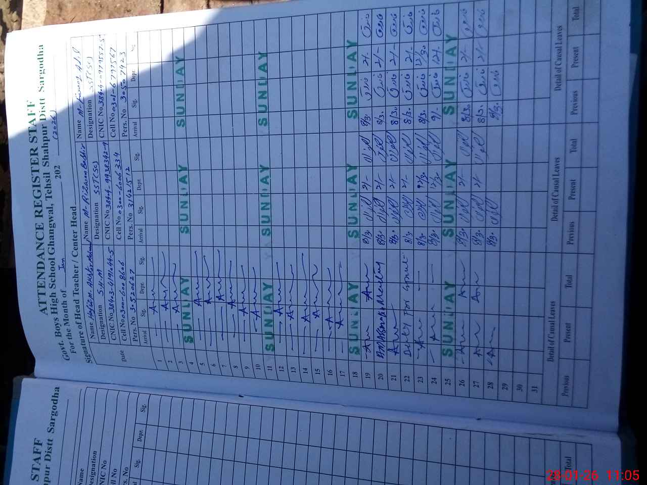 | CNIC | Full Name | Designation | R/C | Absence during last cal. month |