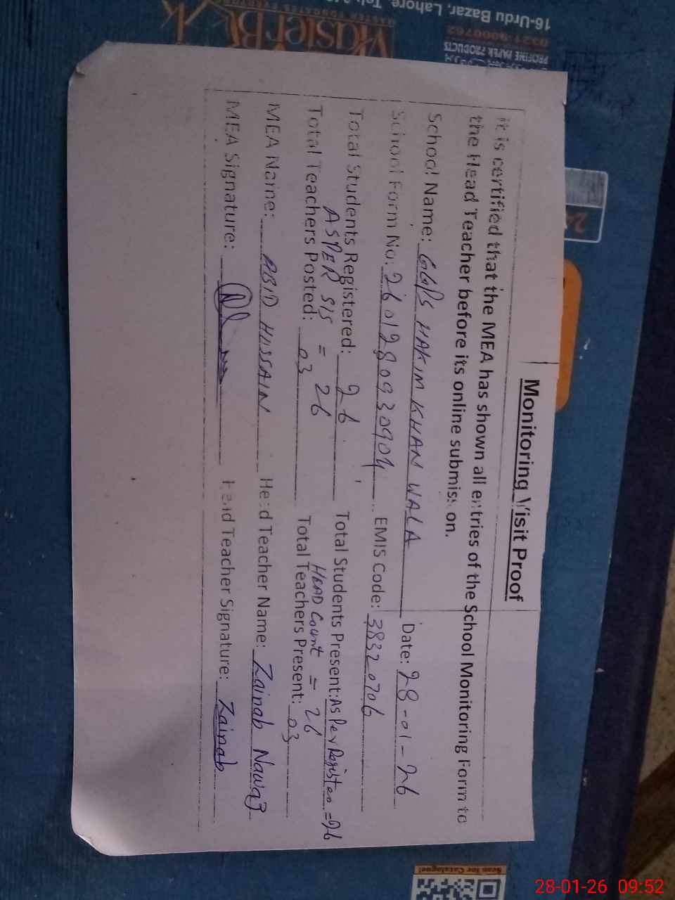 | Attendance Register | Head Teacher | MEA with School | Visit Proof |